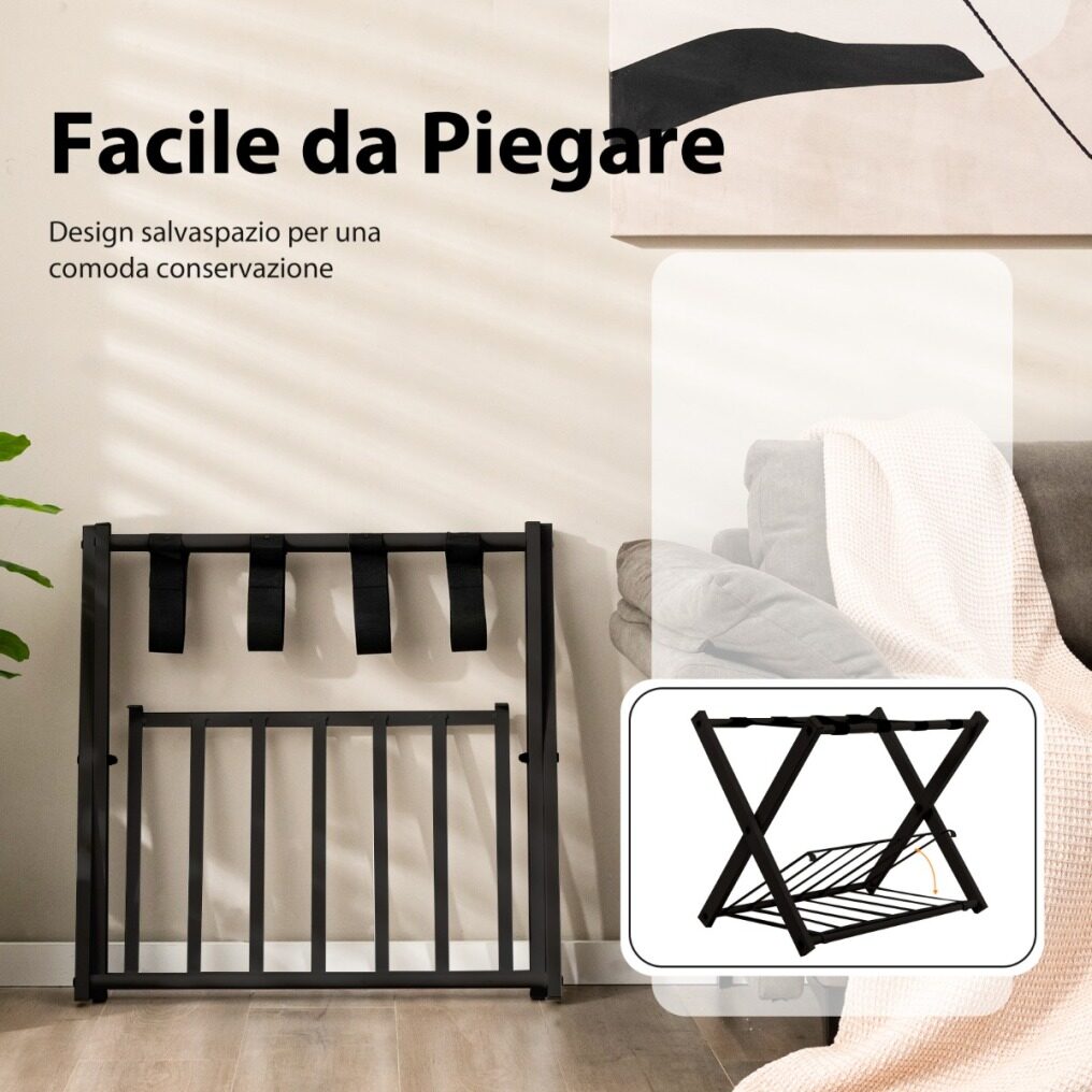 Multi-purpose storage area: The luggage rack consists of two storage areas. The upper one is characterized by the 4 robust, stable straps that can be loaded with medium-sized suitcases or bulky items. In addition, there are 7 iron tubes on the bottom that are ideal for storing smaller items such as shoes and bags.