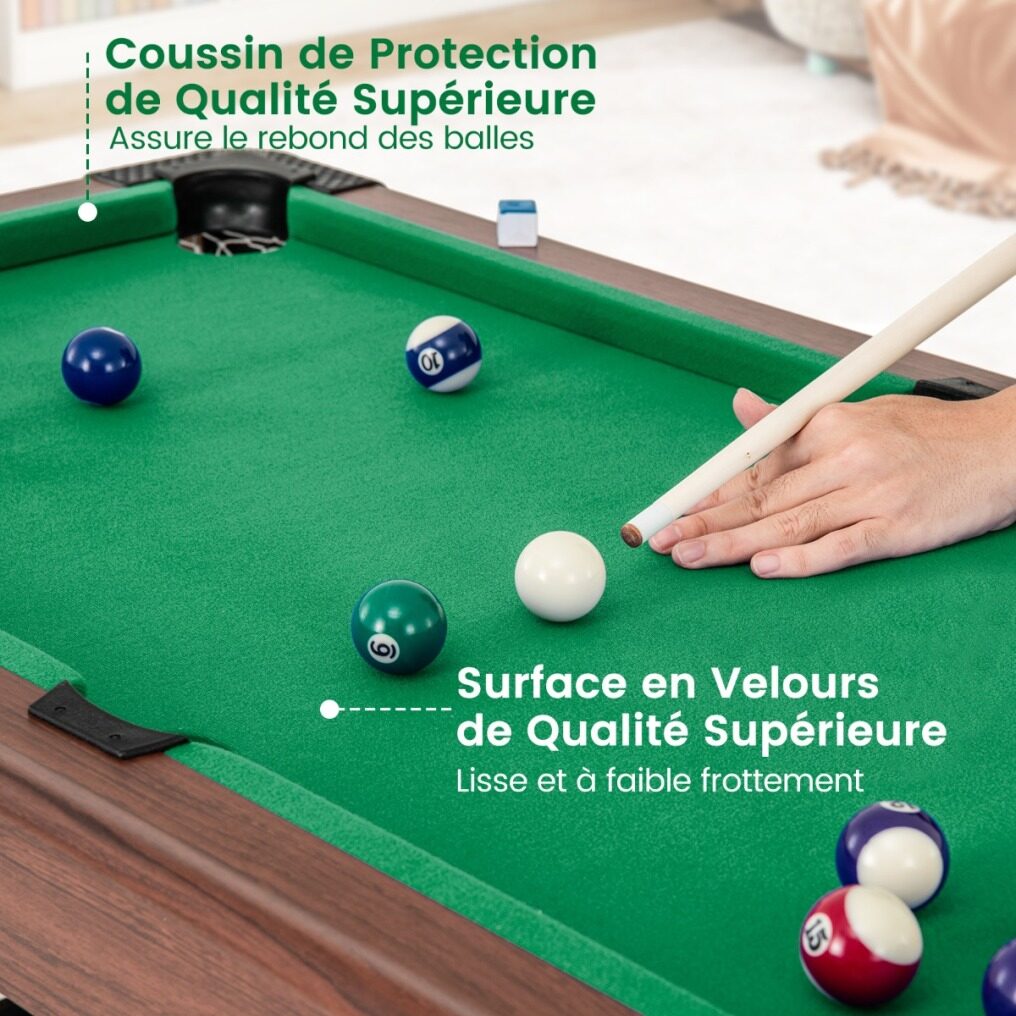 Great Gaming Experience: The 122 cm pool table features a premium velvet surface on the tabletop and adopts solid cue sticks, providing a smooth and low-friction gameplay. Moreover, the premium cushion bumper and strong cotton mesh bags ensure every shot is perfectly buffered and securely pocketed.