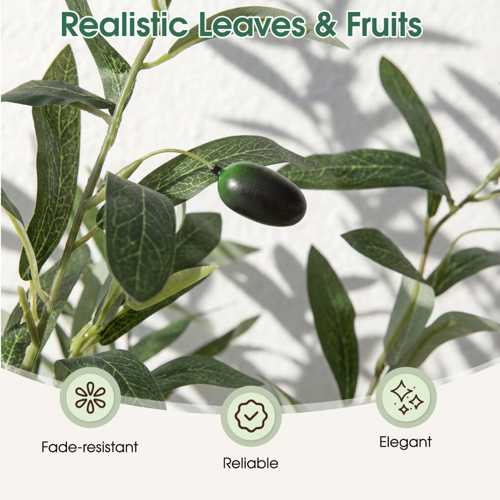 Our artificial olive tree is crafted with high-quality polyester fabric leaves that resist fading and tearing, ensuring a vibrant green display all year round. It comes with a sturdy flowerpot reinforced with built-in cement, providing stability and a touch of authenticity. This versatile tree is perfect for indoor and outdoor settings, enhancing the ambiance of living rooms, porches, and studies alike. With its realistic design, including a sturdy PE trunk and lush mosses, along with lifelike olive fruits, it brings the essence of nature indoors without the need for watering, fertilizing, or pruning. Simply adjust the branches to achieve your desired fluffy shape, and enjoy a maintenance-free, evergreen addition to your space.