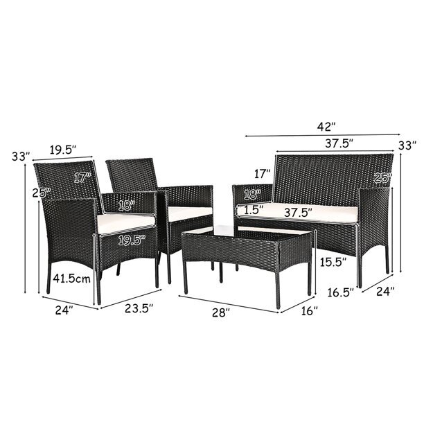 ● Dimension of Patio Furniture Set: Table size: 28'' x 16'' x 15.5'' (L x W x H), single chair size: 24'' x 23.5'' x 33'' (L x W x H), loveseat size: 42'' x 24'' x 33'' (L x W x H), height from floor to seat: 16.5'', height from floor to armrest: 25'', thickness of cushion: 1.5'', table weight capacity: 170lbs, single chair weight capacity: 400 lbs, loveseat weight capacity:800 lbs