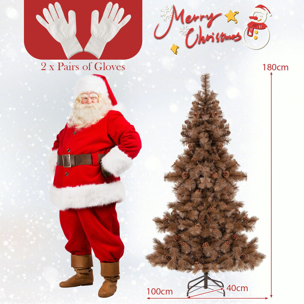Bring the enchantment of a real pine forest into your home with a 1.8M Xmas tree featuring 493 lifelike branch tips, 52 natural pine cones, and pine needles. Illuminate your holiday season with 200 warm white LED lights that create a dazzling display and illuminating holiday cheer. Create a festive glow with the loving lighting show, while a SAA certified adaptor ensures safety. Made from 100% new PVC that are fireproof, anti-fading, non-allergic, and smell-free, this tree will last all season long. Set up is a breeze thanks to hinged connections and a sturdy folding metal stand, including 2 pairs of gloves for easy decorating. With its special chocolate color, this stable Christmas tree will spread festive cheer and help create lasting memories in your home, office, shop, school, or carnival. Merry Christmas!