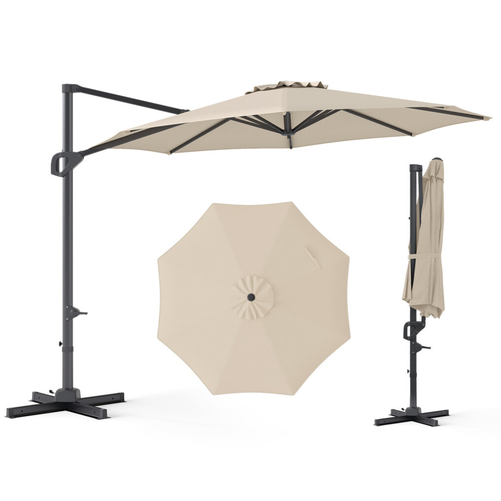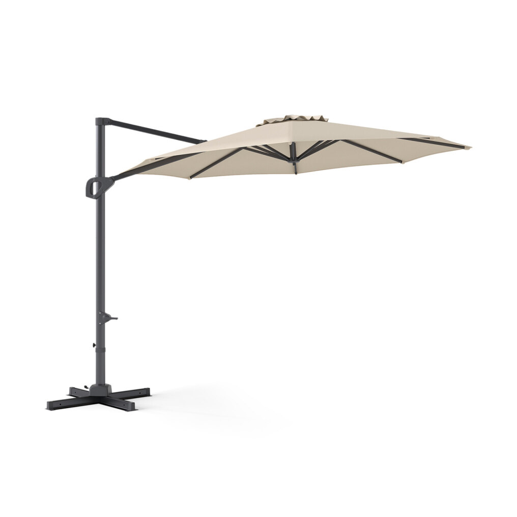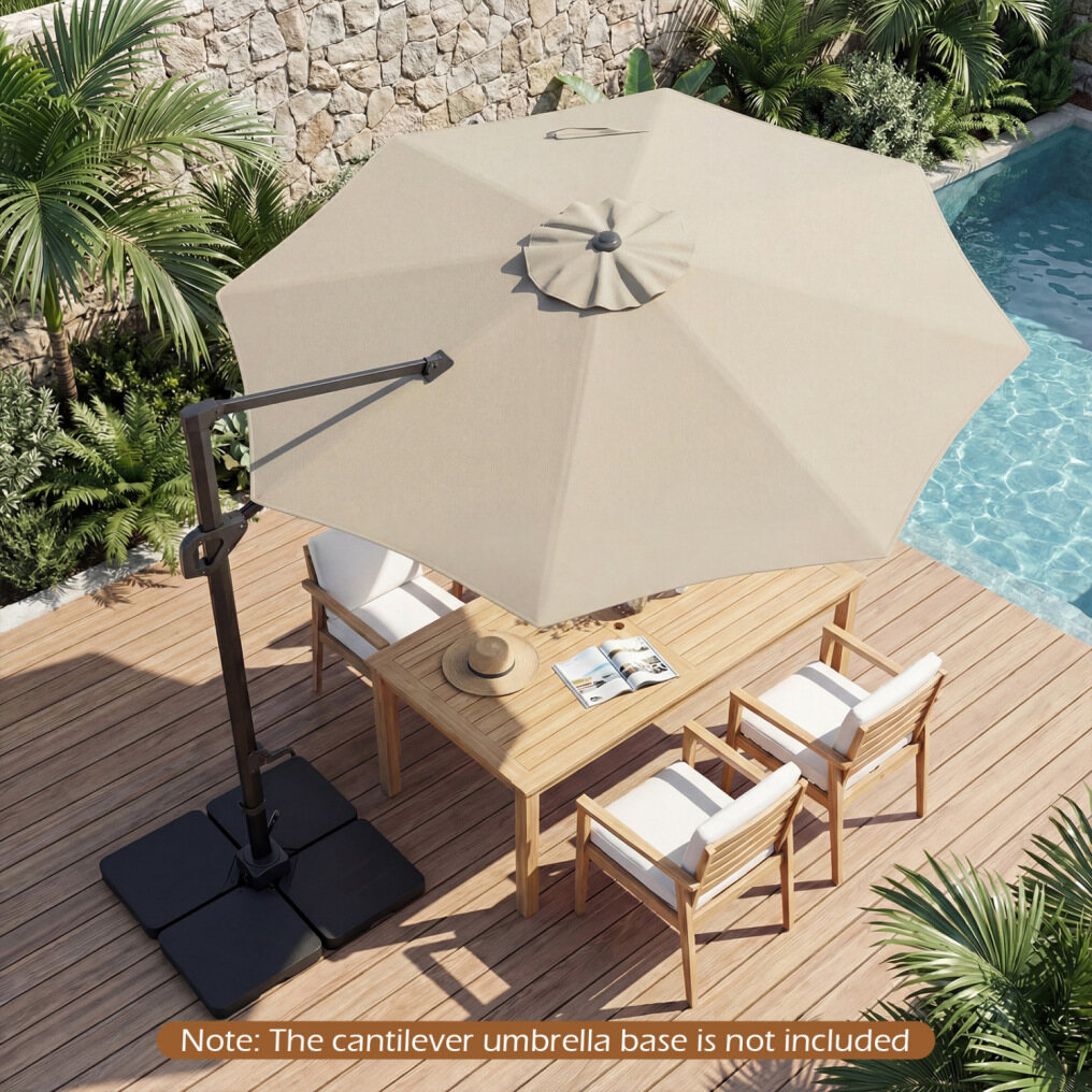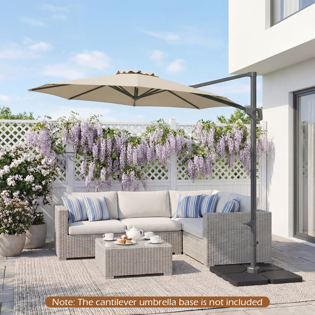 ● Robust and Reliable Structure: The outdoor parasol features 8 heavy-duty metal ribs and an aluminum pole that provide dependable support for the canopy. The vented top promotes airflow to enhance stability, while the included cross metal base pairs with a compatible cantilever umbrella base (not included) to create a more secure foundation.