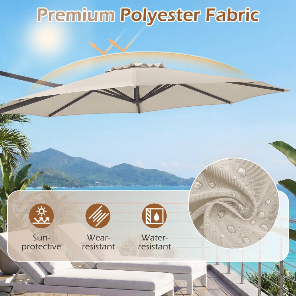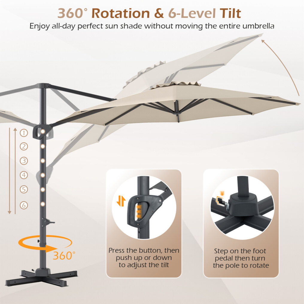 ● Easy Tilt and 360° Rotation: The cantilever umbrella features 6 adjustable tilt angles that allow the height and canopy angle to be tailored for optimal sun protection. The umbrella also rotates smoothly 360° using the convenient foot pedal, allowing shade to follow the sun throughout the day.