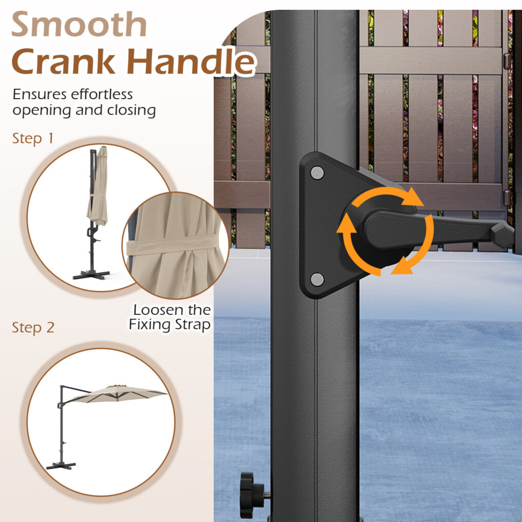 ● Smooth Crank Operation: This offset hanging umbrella incorporates a convenient crank mechanism that makes opening and closing the canopy smooth and effortless. Additionally, a built-in fixing strap helps secure the umbrella neatly when stored.