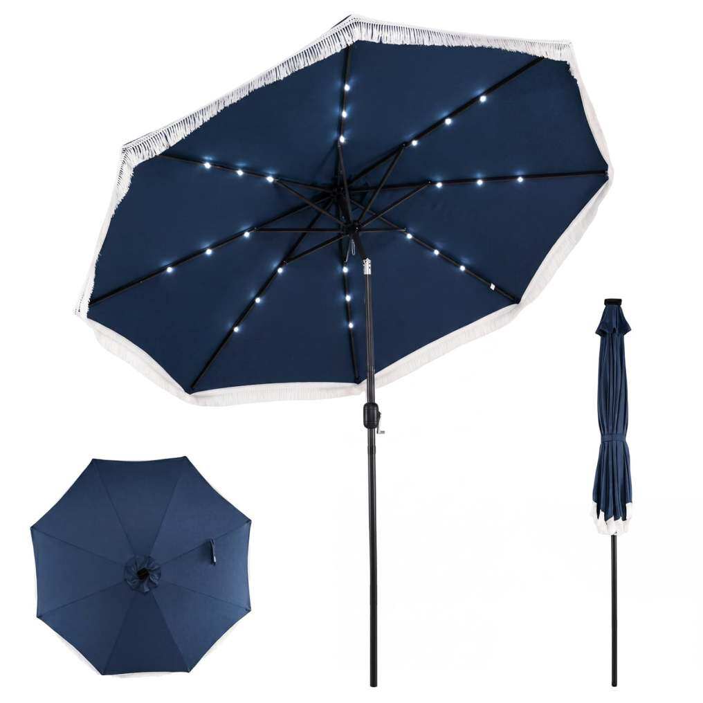 ● Solar Powered LED Lighting: Equipped with 24 built-in LED lights, this patio umbrella creates an inviting atmosphere for evening gatherings. The energy-efficient solar panel charges during the day, offering 6-8 hours of illumination without cords or electricity.