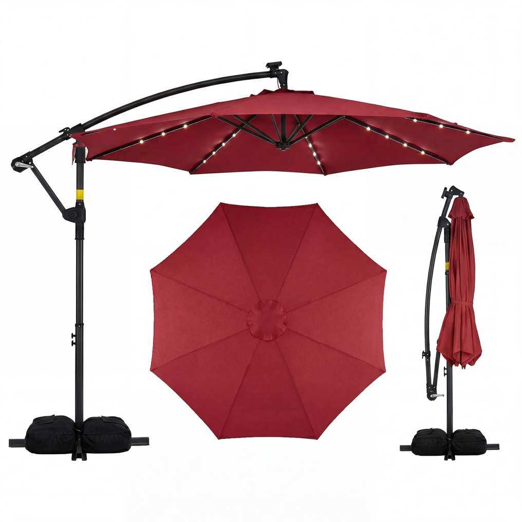 10 FT Solar LED Offset Cantilever Patio Umbrella Hanging Outdoor Market Umbrella-Red