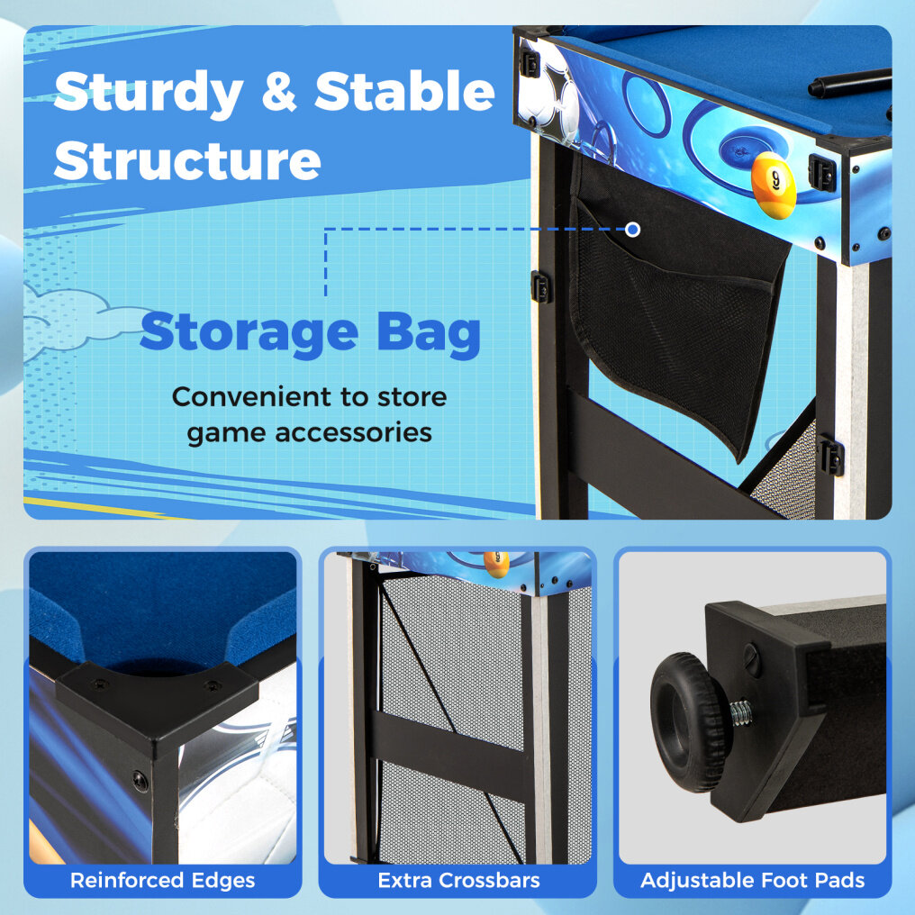 10 Game Options: This combo game table set offers an array of sports options including billiard, hockey, table tennis, shooting, pinball, darts, archery, basketball, soccer, and field hockey. Perfect for family game nights or friends gathering, it brings fun for various age stages.