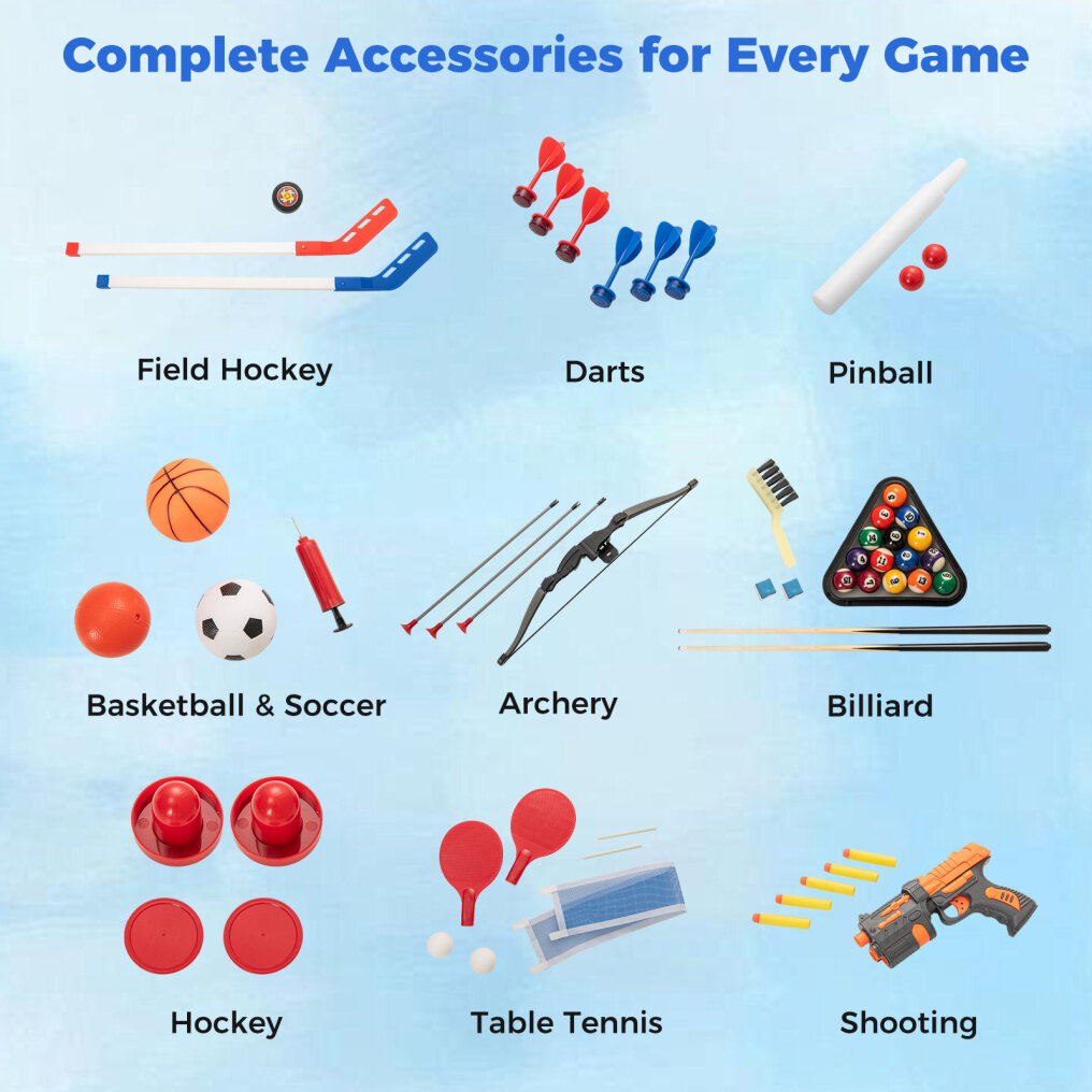 All-Inclusive Accessories: Each game on this multi game table comes with its complete set of accessories, allowing you to jump right into action. From paddles and balls to darts and archery arrows, everything needed to play each game is neatly included, ensuring you are always game-ready.