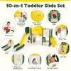 10-in-1 Toddler Slide Set: The 10-in-1 toddler playset features a versatile range of activities, including a telescope, basketball hoop, peek-a-boo window, aisle, slide, ring toss, magnetic whiteboard, crawling tunnel, storage space and climber. Ideal for energetic toddlers, this playset encourages physical activity and adventure.