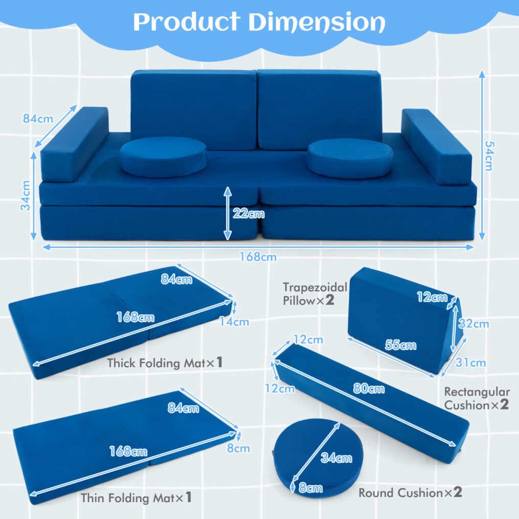 ● 10 Piece Modular Kids Sofa: Consisting of 2 trapezoidal pillows, 2 rounded cushions, 2 rectangular cushions, a thick folding mat and a thin folding mat, this 10-piece children's toy set can be easily reconfigured into a sofa, a tunnel, a fort, a car, a tent, a slide, a bed lounge or anything that your kids can imagine.