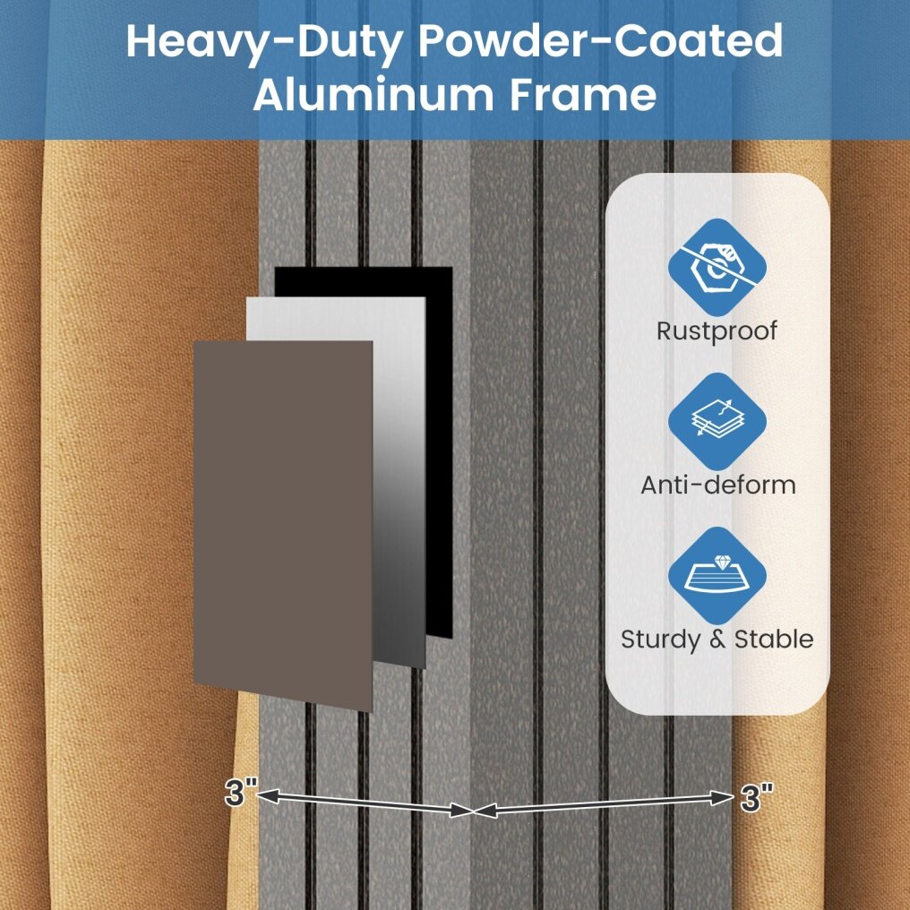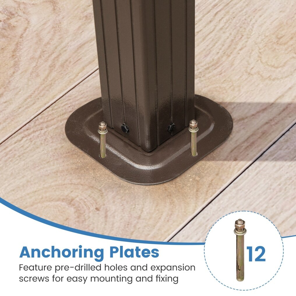 ● Heavy-Duty Aluminum Frame: The supporting frame is constructed of rustproof powder-coated aluminum, reinforced with stable triangular structures, providing reliable support. Moreover, this pergola includes anchoring plates on 4 corners, featuring pre-drilled holes and expansion screws for easy fixing, enhancing stability.