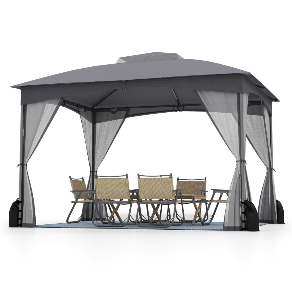 The outdoor gazebo measures 365 x 300 x 288 cm (L x W x H), creating an ample shaded space for a variety of outdoor activities including picnics, parties, and commercial events. It features mesh netting on 4 sides, which offer a panoramic view and keep unwanted guests out. The vented top is crafted with polyester fabric, which will shield you from harsh sunlight and light rain. Plus, the gazebo shelter adopts 2-section support poles that easily connect without the need of tools for easy assembly. The soft top pergola boasts heavy-duty beam structure, 8 supportive metal ribs, ensuring durability and stability. Moreover, the kit includes 4 sandbags to prevent the gazebo being blown away, which can be filled to add weight, along with anchoring plate bases and 8 metal stakes firmly securing the structure to the ground. (Note: Please do not use in extreme weather conditions.)