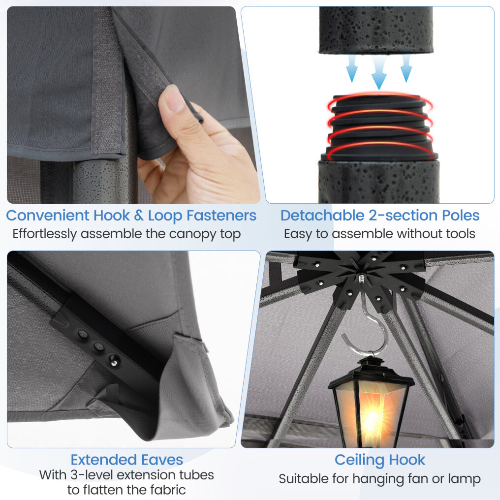 User-friendly Installation: The supporting frame of the patio gazebo consists of 2 sections, which feature a screw-in structure for tool-free assembly. The canopy includes 3-level adjustable extension poles at the extended eaves to easily maintain a smooth, unwrinkled canopy top.
