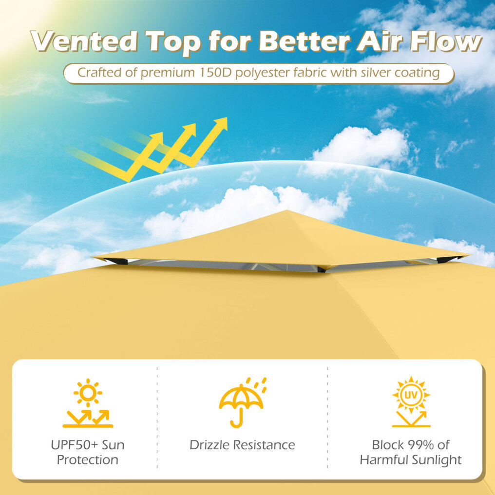 ● Advanced Sun Defence: Crafted of premium 150D oxford fabric with silver coating, this pop up canopy offers UPF50+ sun protection, blocking 99% of harmful sunlight. Plus, its vented top creates superior airflow, ensuring comfort, shade, and peace of mind for sun-drenched outdoor days.