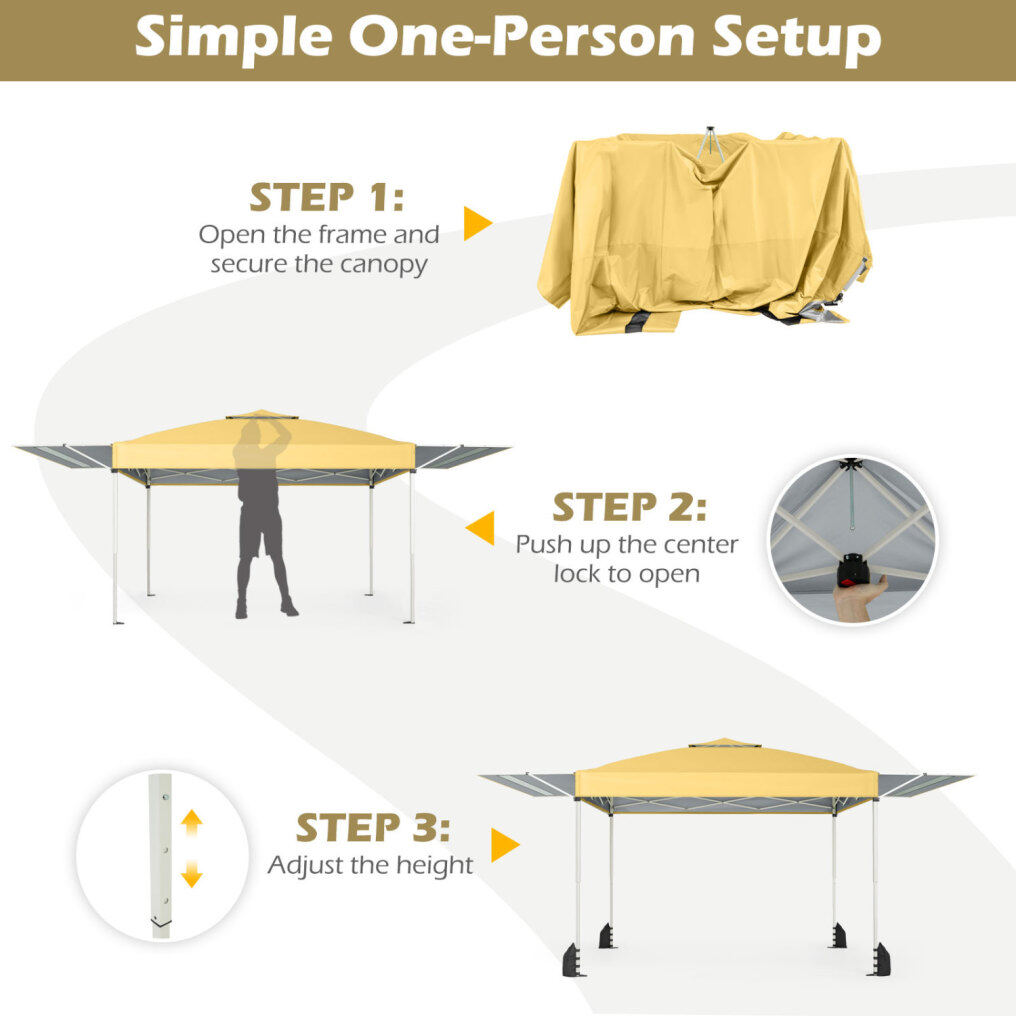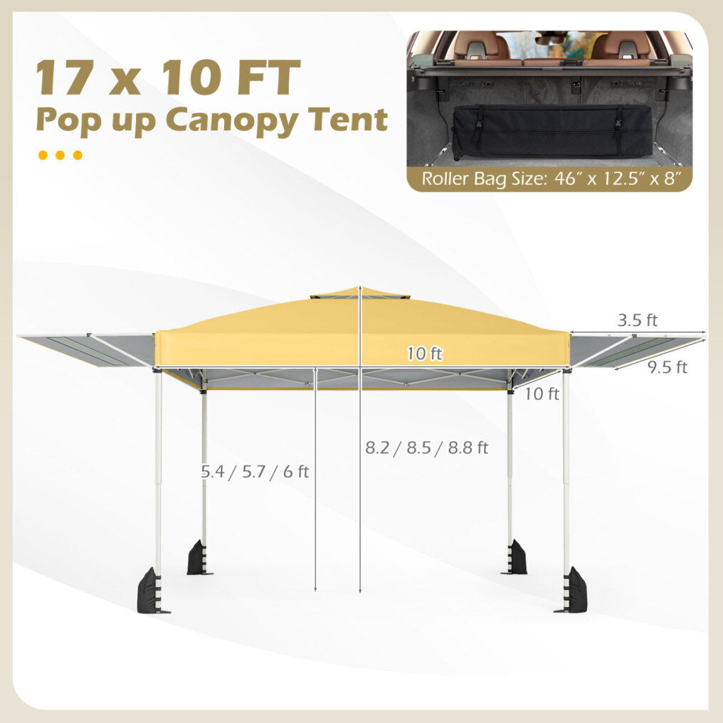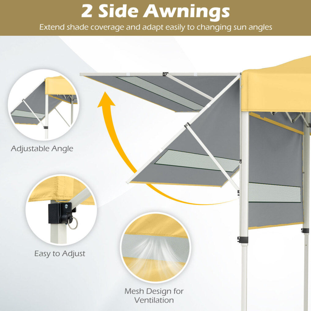 ● Dual Awnings, Wider Reach: This instant portable shelter offers 170 sq.ft/15.3 m2 of coverage with a 10 x 10 ft/300 x 300 cm base plus dual 3 ft/105 cm adjustable awnings, which could comfortably shade 10- 18 people and a full picnic table. 2 half awnings expand shade as the sun moves, and the mesh design keeps air flowing for a breezier hangout.
