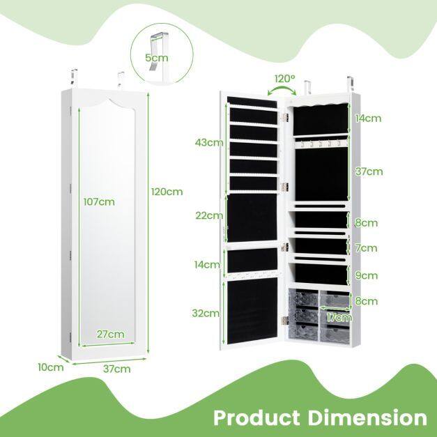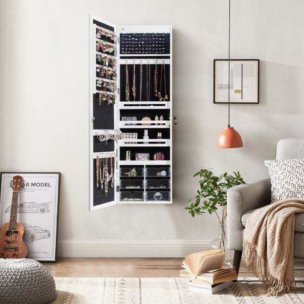 ● 2 in 1 mirrored jewelry cabinet: This jewelry cabinet allows you to enjoy the dual benefits of a jewelry armoire and a vanity mirror. On the one hand, it has a practical storage function. On the other hand, the embedded full length mirror offers a better view for your head-to-toe outfit checking.