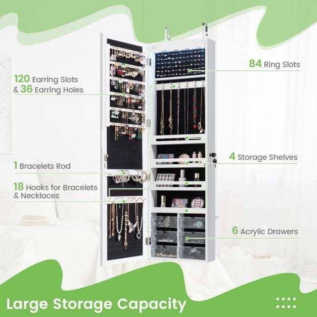 ● Roomy storage space: Inside this lockable jewelry cabinet, there are 120 earring slots, 36 earring holes, 84 ring slots, 12 single hooks, 6 double hooks, 4 shelves and 6 drawers, which keep all your jewelry neatly organized and maintained in good condition.