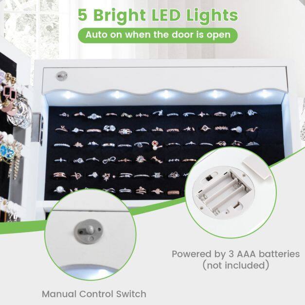 ● 5 automatic led lights: With 5 led lights (powered by 3 aaa batteries, not included) which will automatically turn on when the cabinet door is opened, you can see the jewelry clearly and easily choose the right one without waking up your husband and children in the early morning.