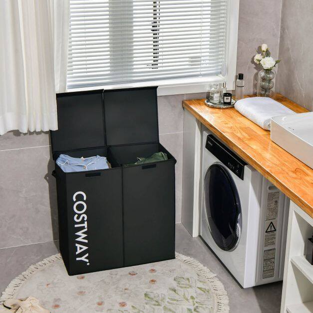 105 L large capacity provides ample storage space for your clothes, towels, and bed linens. The lid of the laundry basket keeps the piled-up dirty clothes inside for a tidy look while preventing unpleasant odors. Moreover, the 2-section design enables you to sort clothes of different colors and materials. Crafted with thickened non-woven fabric and wooden board, this laundry hamper is durable and strong to support long-lasting use. Considering convenient use, the laundry hamper comes with side handles for easy transportation. All in all, this clothes hamper is a perfect piece for the laundry room, bathroom, and bedroom. If you are looking for such a product, do not hesitate to buy it!