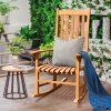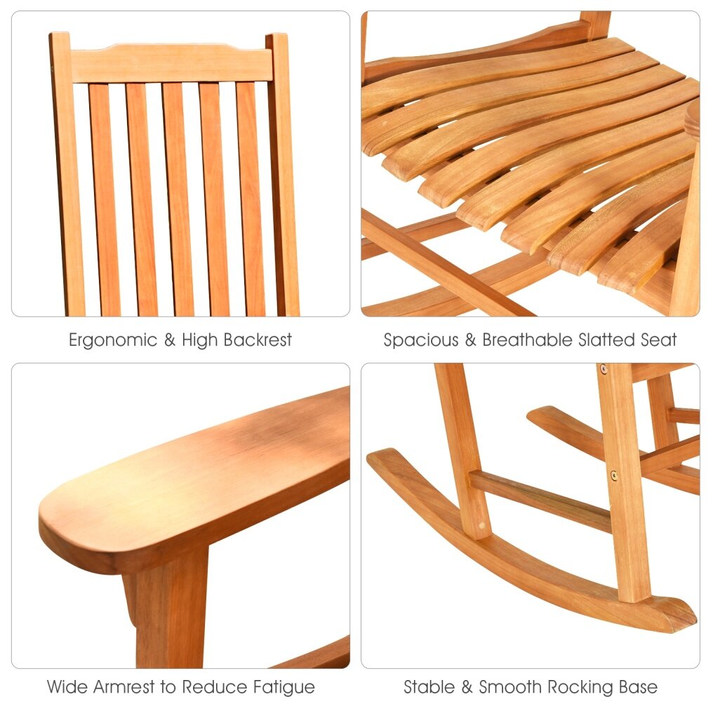 The image of you is drinking a cup of tea and appreciating your flowers lying on the outdoor rocking chair. This rocking chair is designed with a contoured slatted seat, high back, and widened armrest, which brings you more comfort than other chairs. Made of premium eucalyptus wood with linseed oil varnish cover, this corrosion-resistant rocking chair can withstand all four seasons and a range of climates. Assembly is also easy for adults, including the elder.
