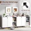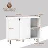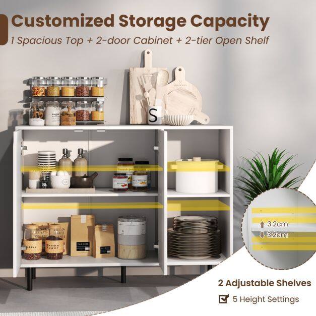 The buffet sideboard includes a spacious countertop, a 2-door cabinet with an internal shelf, and a 2-tier open shelf that provide ample space for storing dinnerware, kitchen supplies, and more. The shelves are adjustable in 3.2cm increments, allowing customization for items of varying sizes. The storage unit is supported by 5 sturdy metal legs for high stability. And the anti-toppling device is designed for added safety. Moreover, the elevated base ensures compatibility with robotic vacuum cleaners, bringing much more convenience in cleaning. Whether positioned in the kitchen, entryway, dining room, or used as a coffee bar, this buffet cabinet with well-crafted details enhances space functionality. Upgrade your home’s storage and style with this versatile buffet cabinet.