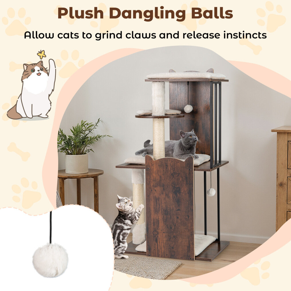 Multi-Level Activity Space: This 112 cm tall wooden cat tree features 3 spacious platforms and 1 round platform, paired with soft padded cushions, offering cozy spots for lounging, overlooking, napping, and playing. Plus, it includes 2 plush dangling balls, enticing playful interaction and adding more fun.