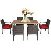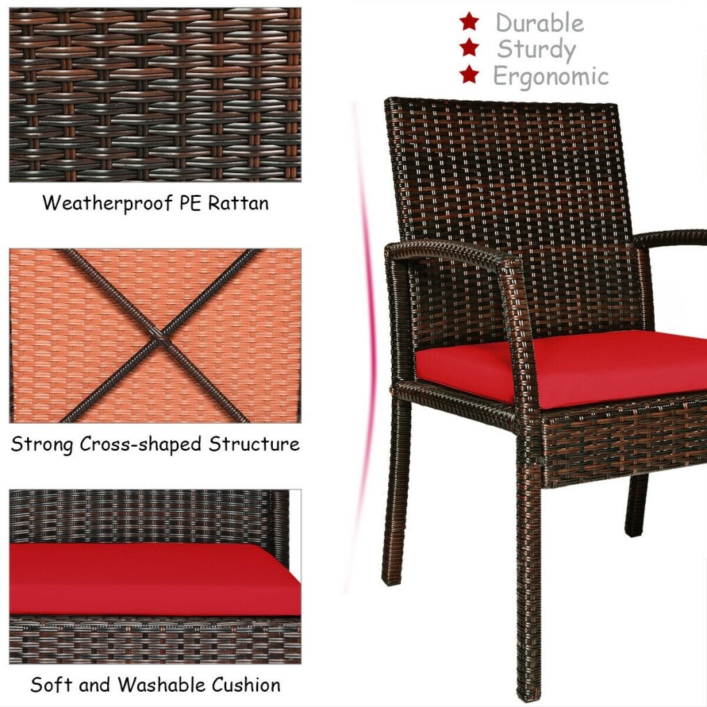 ● All-weather Structure for Outdoor Use: This patio dining set is made of weather-resistant PE wicker and powder-coated steel, which has excellent rust resistance and durability to ensure year-round use. And the premium acacia wood table also comes with a 2.16” umbrella hole for most umbrellas. Besides, the slat design of the tabletop can also avoid rainwater accumulation.