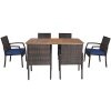 This amazing dining set includes a dining table and 6 armchairs. Made of high-quality PE rattan and powder-coating steel frame, the set is durable and weather-resistant.
