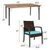 This amazing dining set includes a dining table and 6 armchairs. Made of high-quality PE rattan and powder-coating steel frame, the set is durable and weather-resistant.