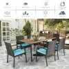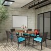 The spacious acacia wood tabletop provides plenty of space for you to prepare hearty dishes or drinks. What’s more, it can be used with an umbrella, so you still can enjoy your outdoor time in a hot day or rainy day. 6 ergonomic armchairs are equipped with soft cushions to relieve your fatigue, so that you will not be tired after sitting for a long time. This patio dining furniture set is a good choice to your backyard, balcony, patio, etc. Do not miss it!