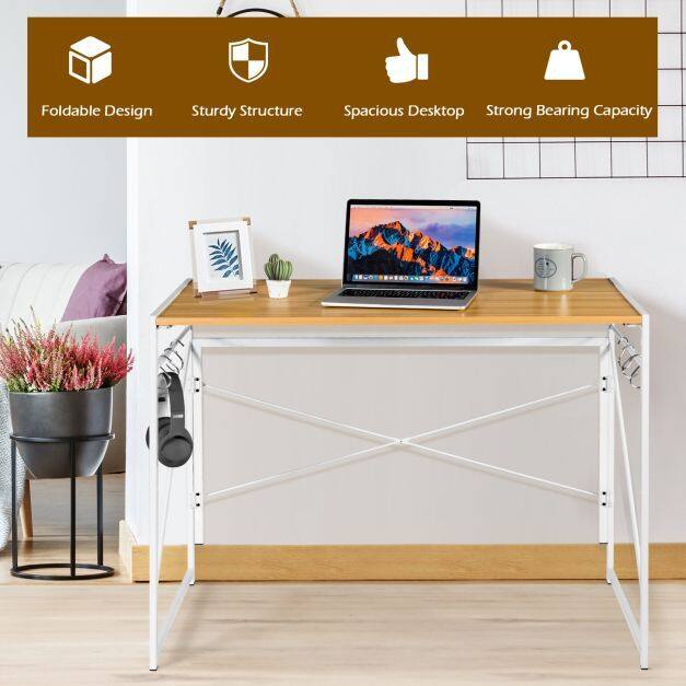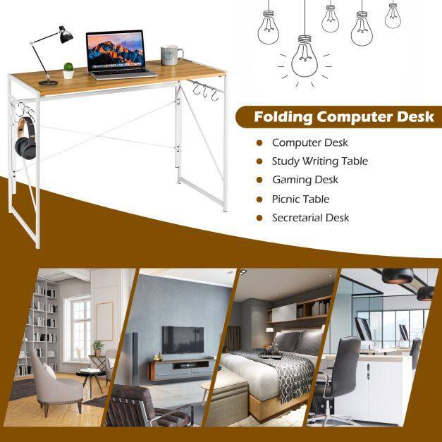 Crafted of selected engineered wood and spraying metal frame, this computer desk is antirust and durable for long time use. Specially designed X-shaped structure, crossbars, and anti-skid foot pads can strongly enhance stability for high load-bearing capacity. Featuring a spacious desktop and 6 additional hooks, the table provides ample space to place office supplies and hang your headphone or small objects. What's more, it can be folded when not in use to save space. You can even put it in the trunk and go out for a picnic. Precision workmanship with the beautiful wood grain will add a touch of charm and elegance to your home. Minimalist and stylish design makes it ideal for living room, bedroom, study, office, etc.