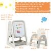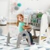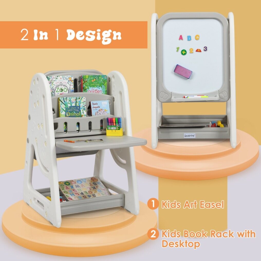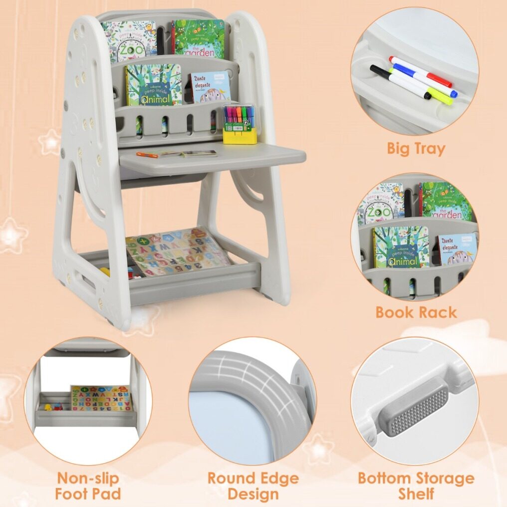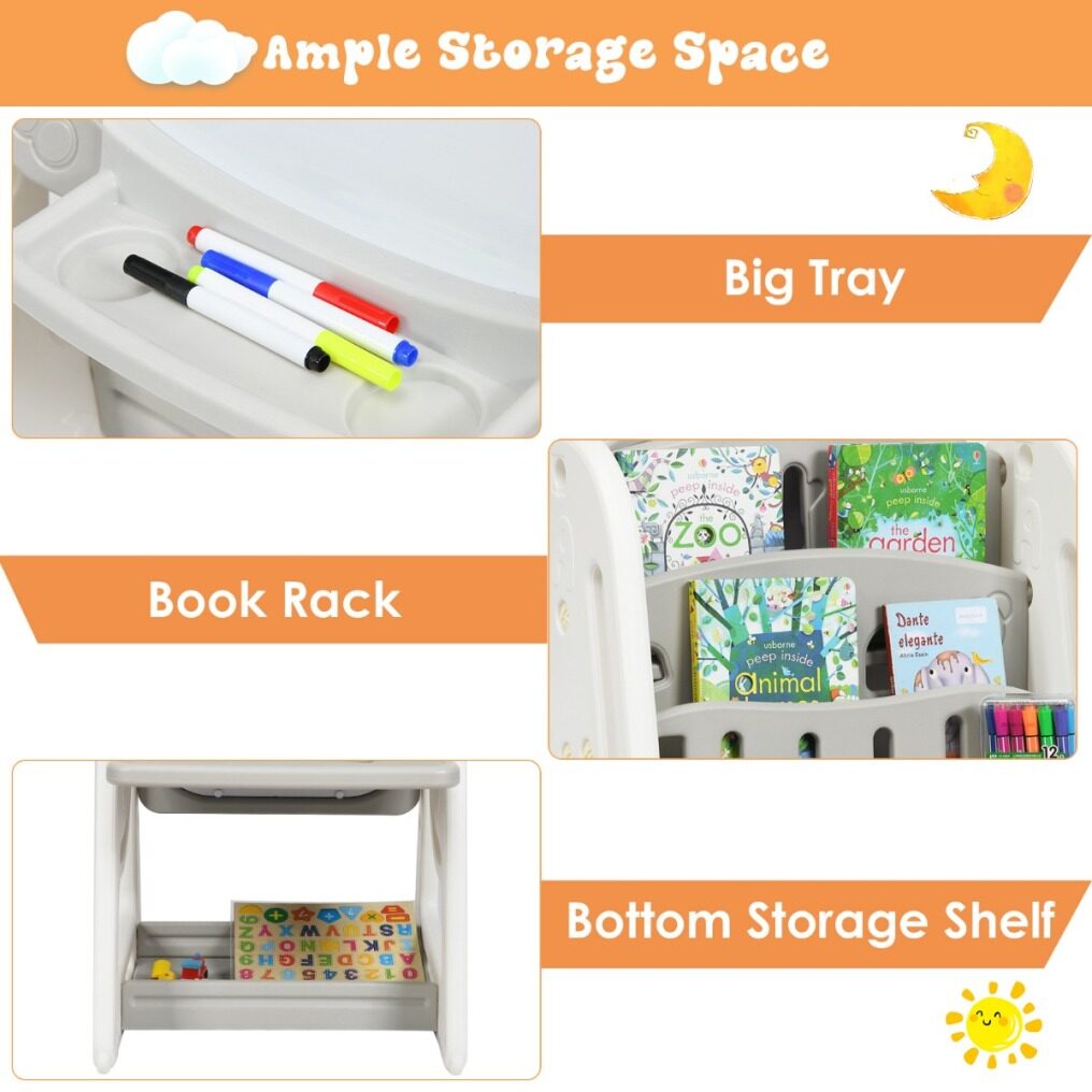 Versatile Table with Bookcase and Blackboard: The table is multifunctional with a bookcase to place storybooks and have a place to study, play and read. The back of the table is equipped with an erasable magnetic whiteboard for drawing, with a tray to carry the 4 colored whiteboard pens and an eraser as a gift.