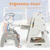 The table offers versatile and practical use with a flip top, a 2-tier bookcase, an erasable magnetic whiteboard, a stationery and accessory tray and a large storage shelf. The ergonomic chair ensures correct posture and comfortable sitting, and the whiteboard is liftable to 3 levels to accommodate comfortable use for children while standing or sitting.