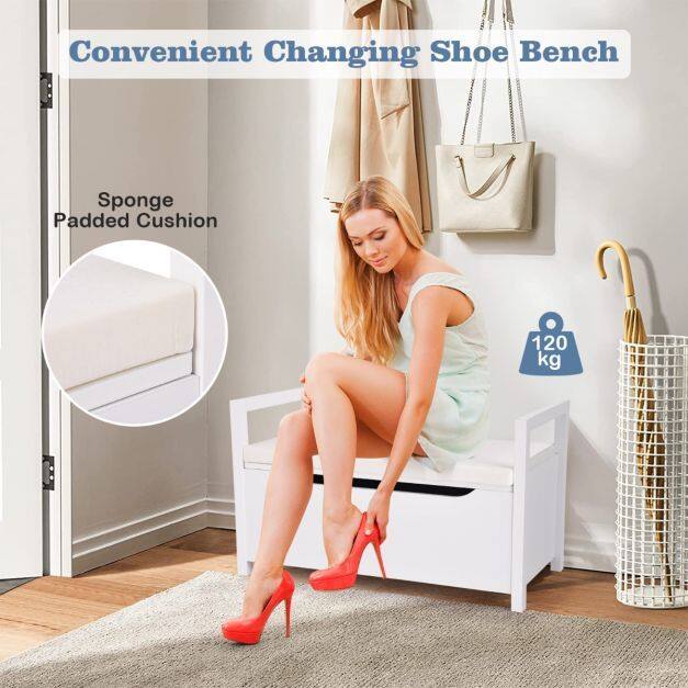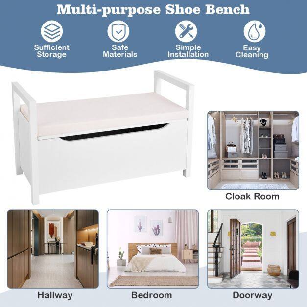 Take a seat and put on your favorite shoes. The best way to start and end the day is with this simple but modern shoe bench at your home. This classic yet modern style shoe bench with a padded seat is a must have for any front entryway. Crafted by sturdy materials, built to last for many years, this entryway shoe storage bench ensures that your space is tidy with your shoes hidden away. Use this storage bench to read your favorite books, then store them away inside when done, or put this bench in the playroom to store children’s toys - the possibilities are many, perfect for any entryway, bedroom, closet, porch, foyer, mudroom.