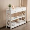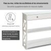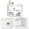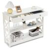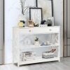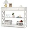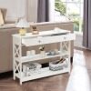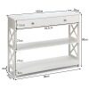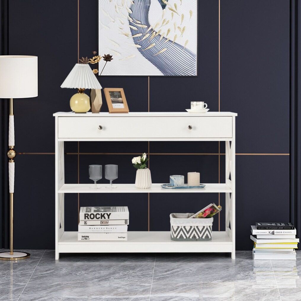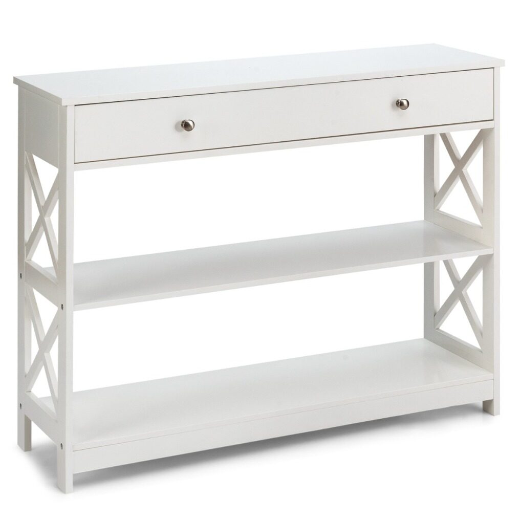 This accent table featuring 1 bulky drawer,2 long shelves, and a wide table desk, this accent table offers you ample storage and display areas.