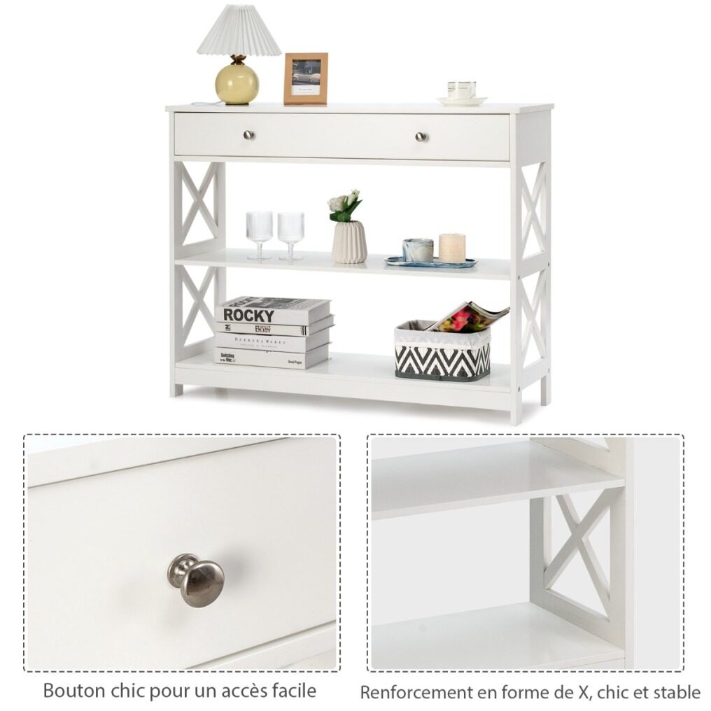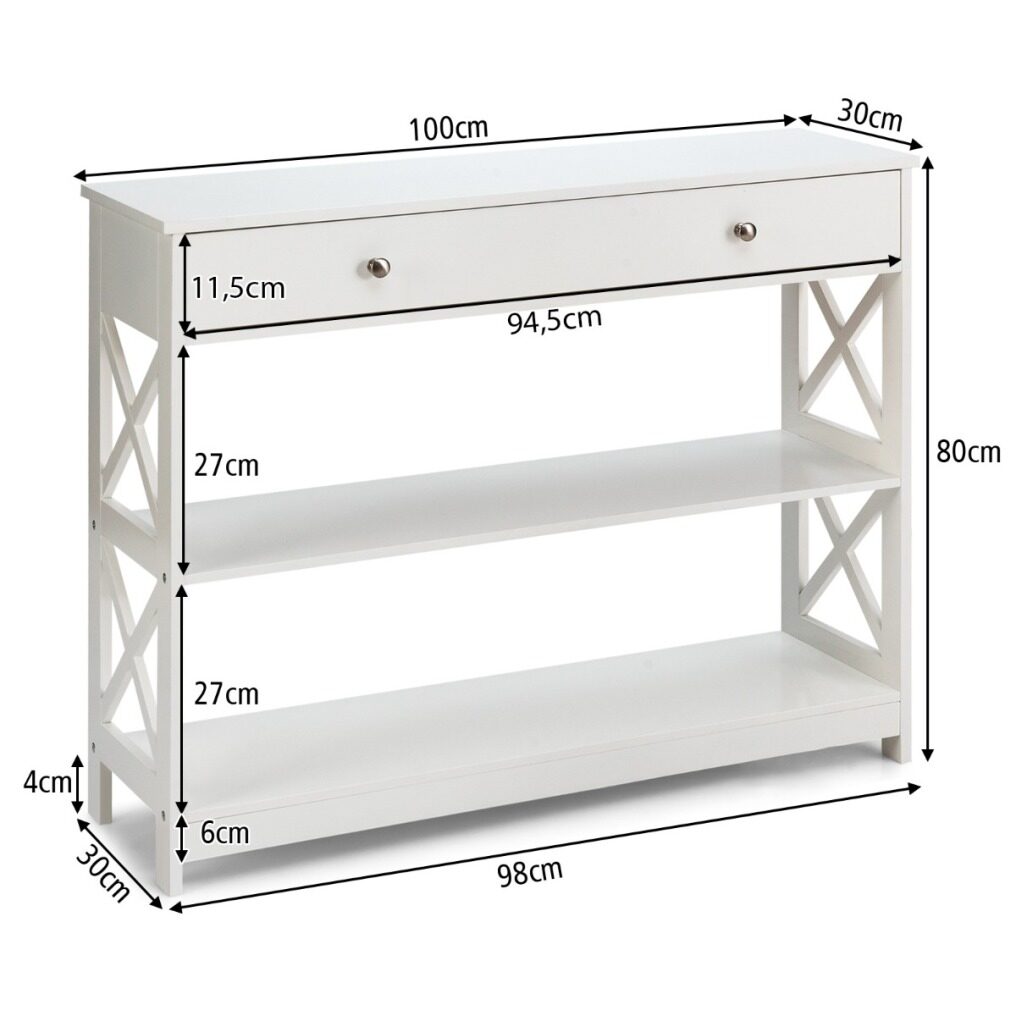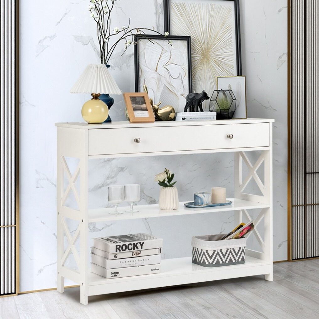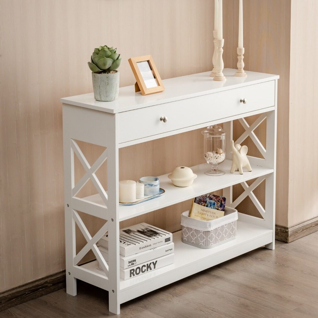 - With 1 drawer and 2 long shelves plus a wide tabletop for bulky storage