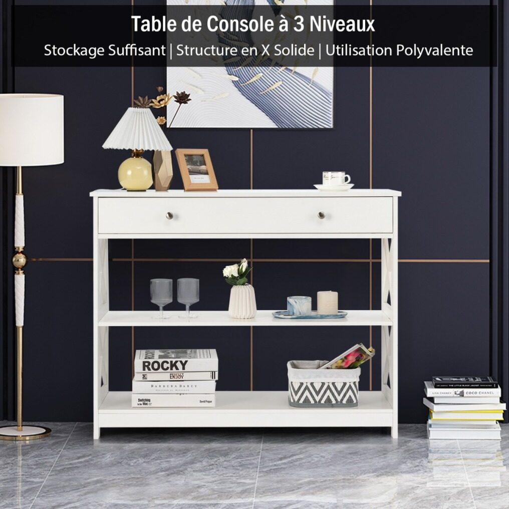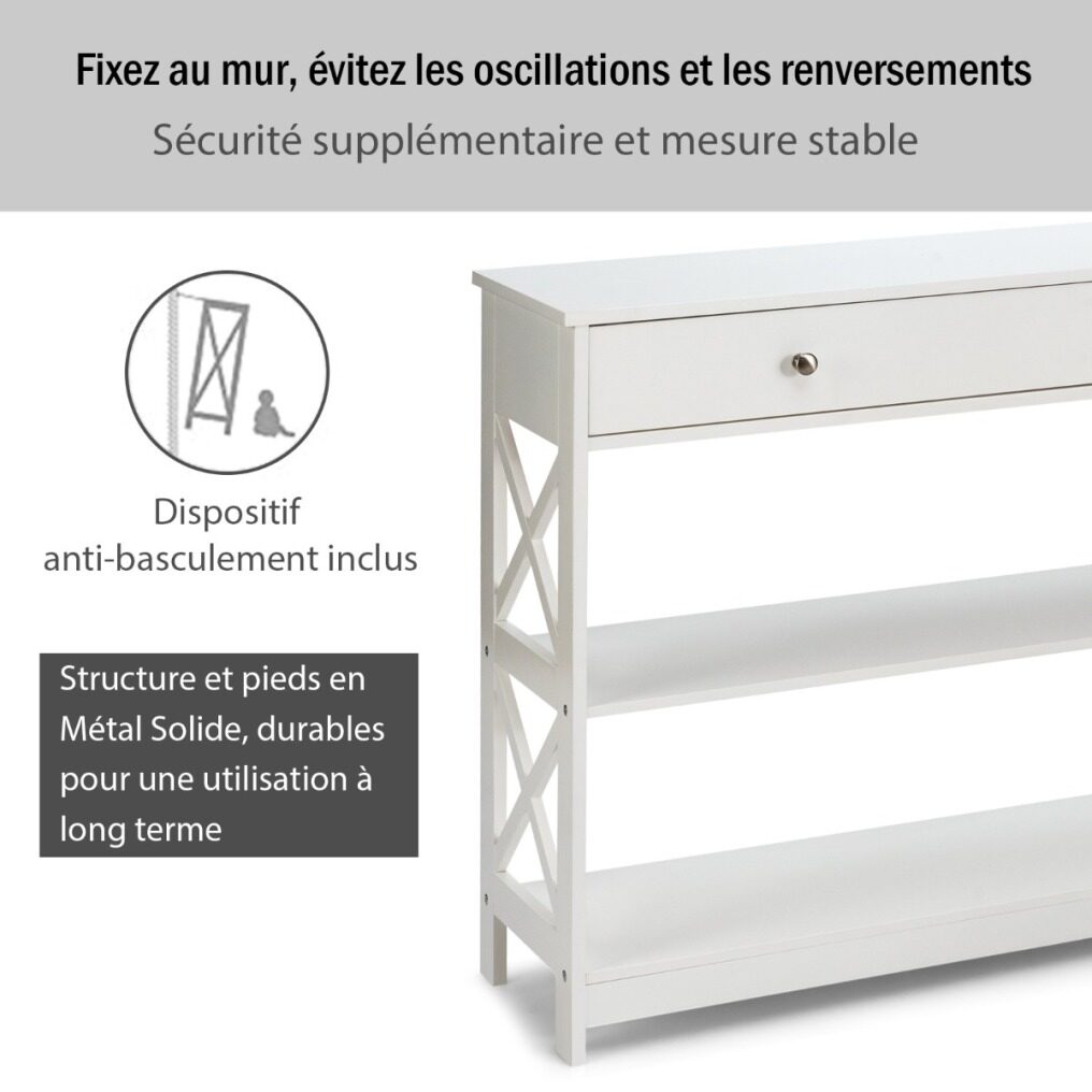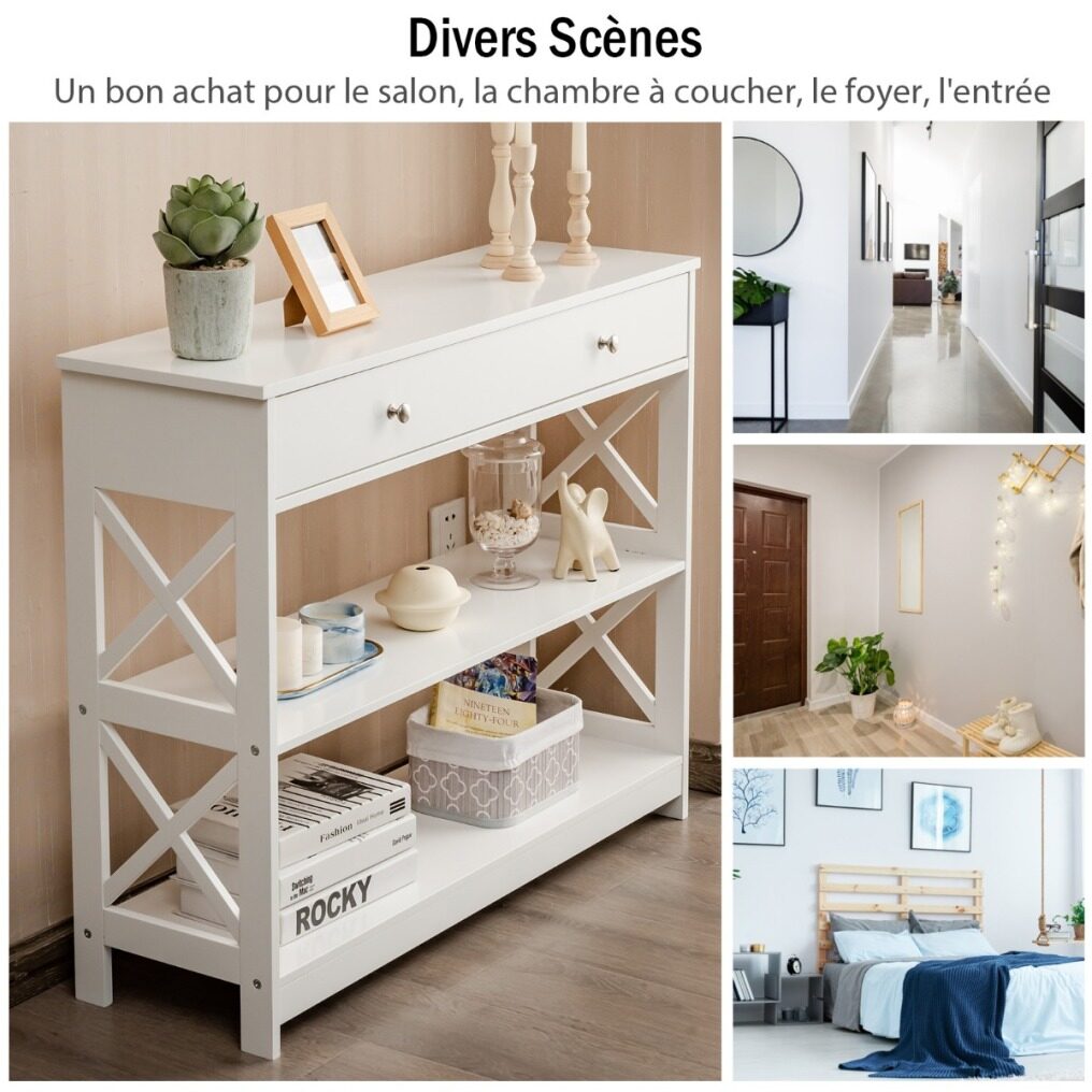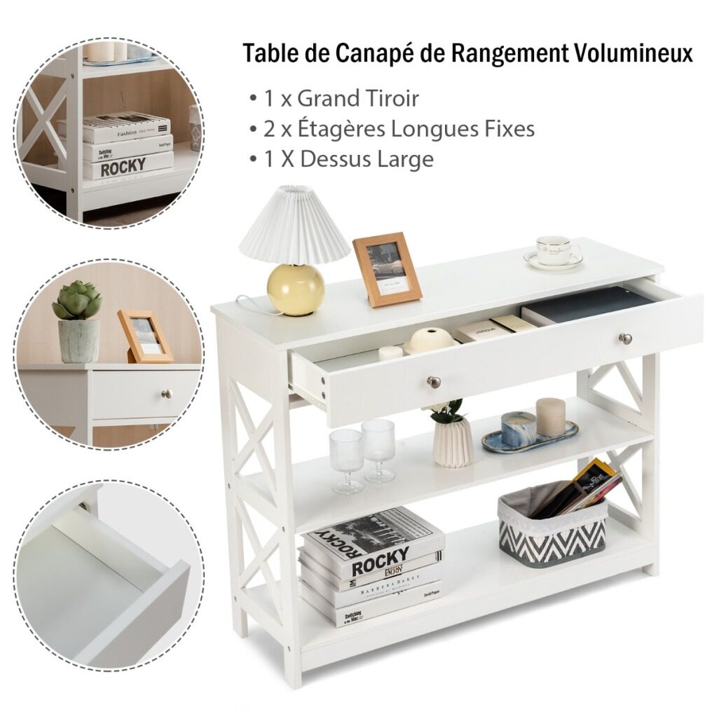 - With 1 drawer and 2 long shelves plus a wide tabletop for bulky storage