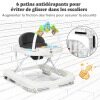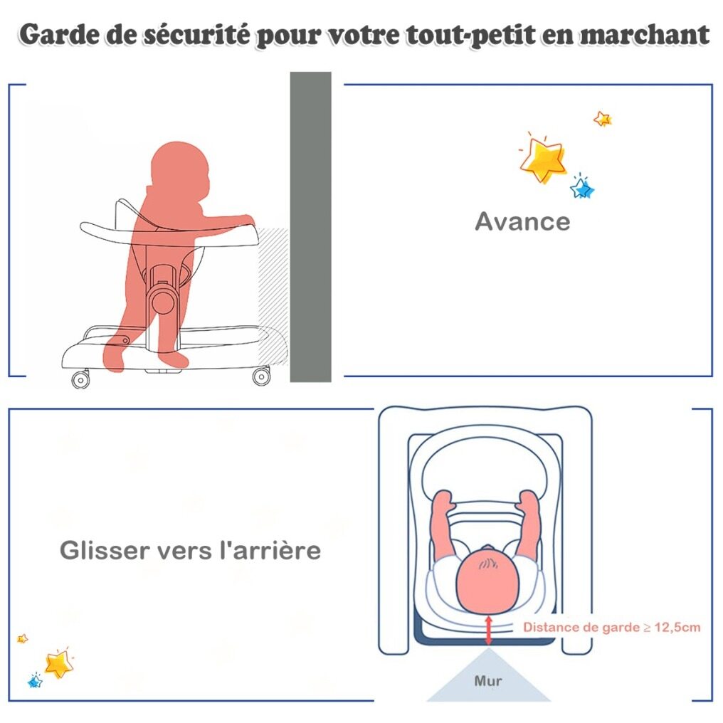 ● 2-in-1 Baby Walker: This baby walker can be easily converted from the seated one into the walk-behind walker with the detachable bar and it has a safeguard distance of 5” to avoid an accidental crash while backward sliding. The optional baby learning walker helps apply balanced force to both feet so as to effectively avoid bow-legged walking.