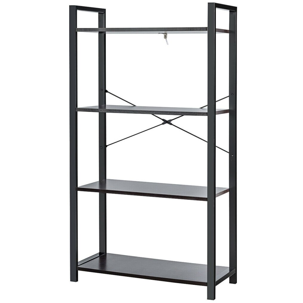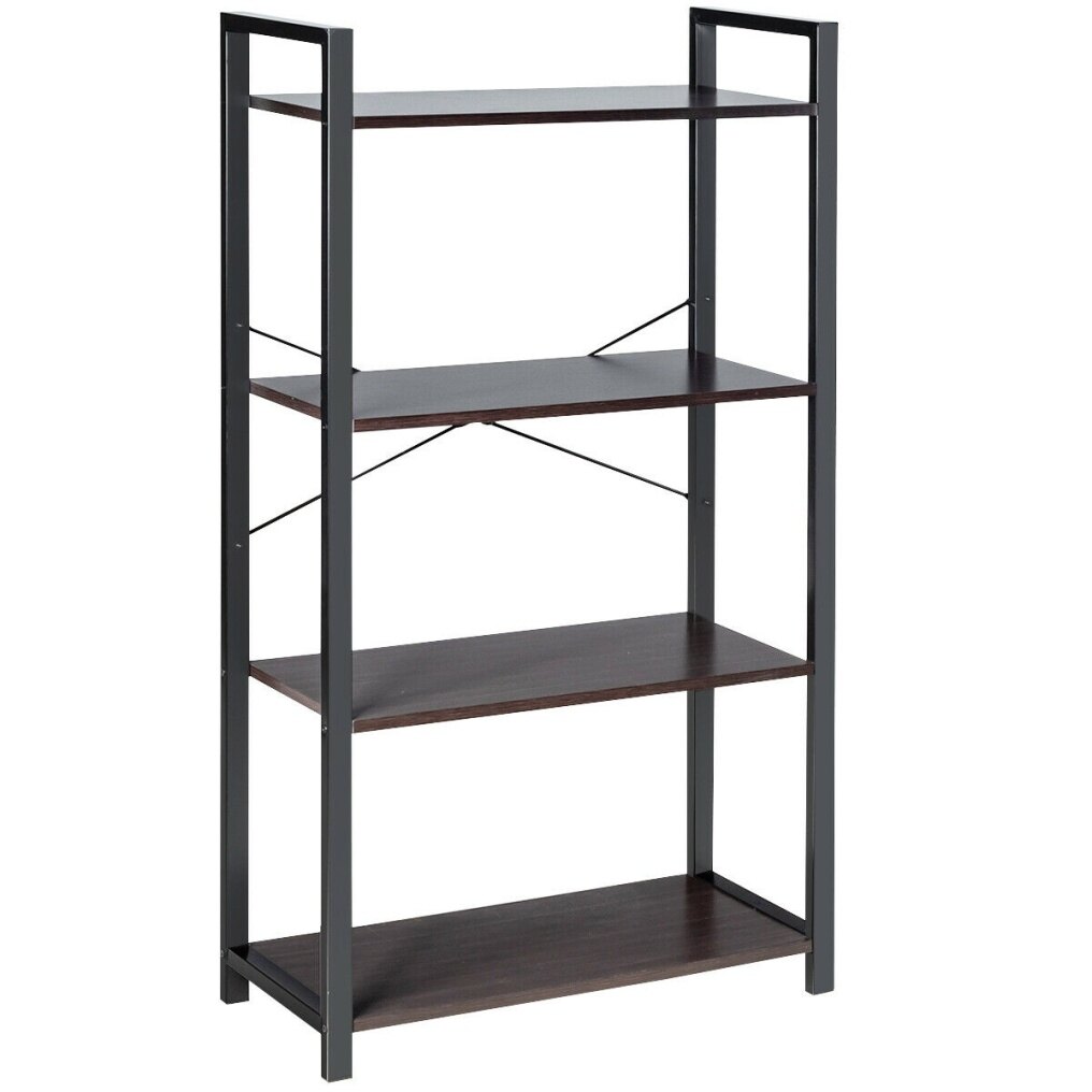 Made of high-quality particle board and iron, the 4-tier storage shelf is sturdy and durable for a long-time use. Equipped with an anti-tip device, the bookcase can be anchored to the wall so as to avoid wobbling or tipping. And the X-shaped bracket at the back can reinforce its frame. This multipurpose shelf can be used as a bookcase, flower stand or display rack for holding books, photo frames, plants, etc. It can be widely used in living room, bedroom, kitchen and many other places.