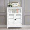 Practical Details: Our bathroom cabinet has 2 lamellar doors that protect your items against dust and at the same time ensure good ventilation inside. Equipped with metal handles, swivel hinges and magnets, they can be easily opened and closed. The well thought-out anti-tip device enables it to be attached to the wall and prevents it from accidentally tipping over.