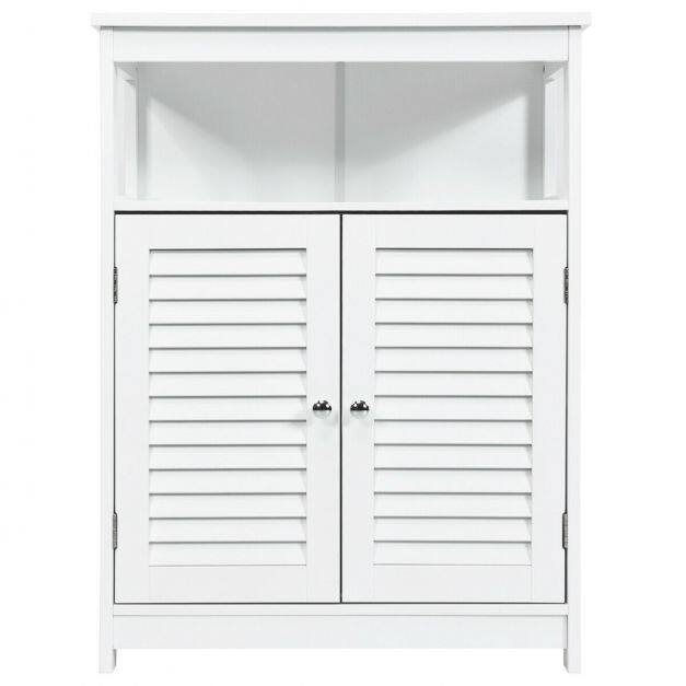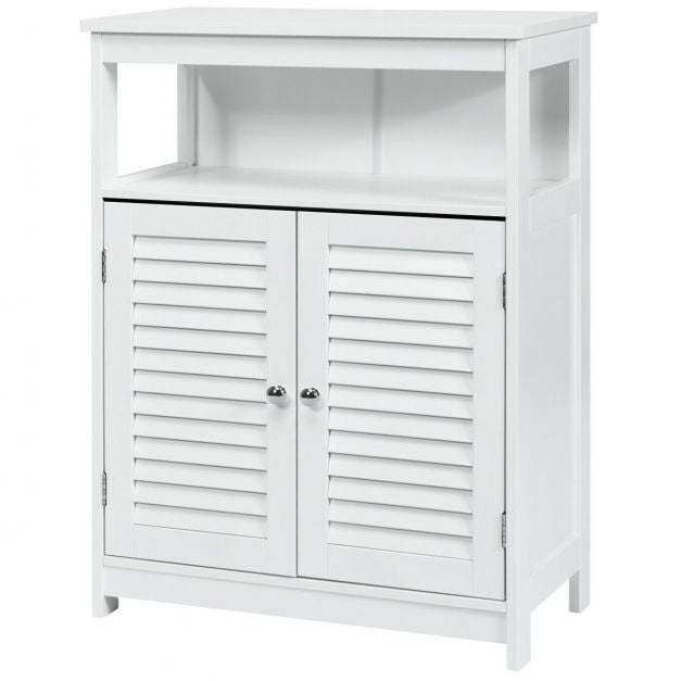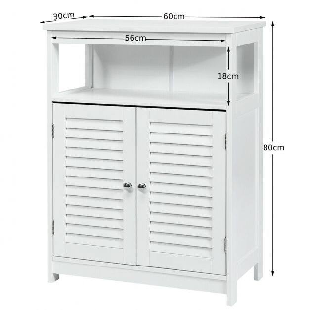 Our bathroom cabinet with double doors is the perfect piece of furniture. The simple and modern shape with a neutral color brings a breath of fresh air into your home and can be integrated into almost any furnishing style. The smooth and lacquered surface gives the bathroom cabinet water-repellent properties and makes it ideal for humid environments. The spacious shelves with height-adjustable shelves and an open shelf offer you enough space to store bathroom items and decorations. 2 practical lamellar doors effectively protect your objects from dust and at the same time ensure good ventilation so that mold has no chance. Equipped with metal handles, assembly is quick and easy!