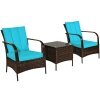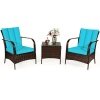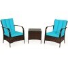 ● Dimensions of 3 Pieces Rattan Set: Size of chair: 25.5” x 28.8” x 33.5” (L x W x H), size of table: 19.5’’ x 19.5’’ x 19.5’’ (L x W x H), maximum load-bearing of chair: 360 Ibs, maximum load-bearing of the table: 90 Ibs.