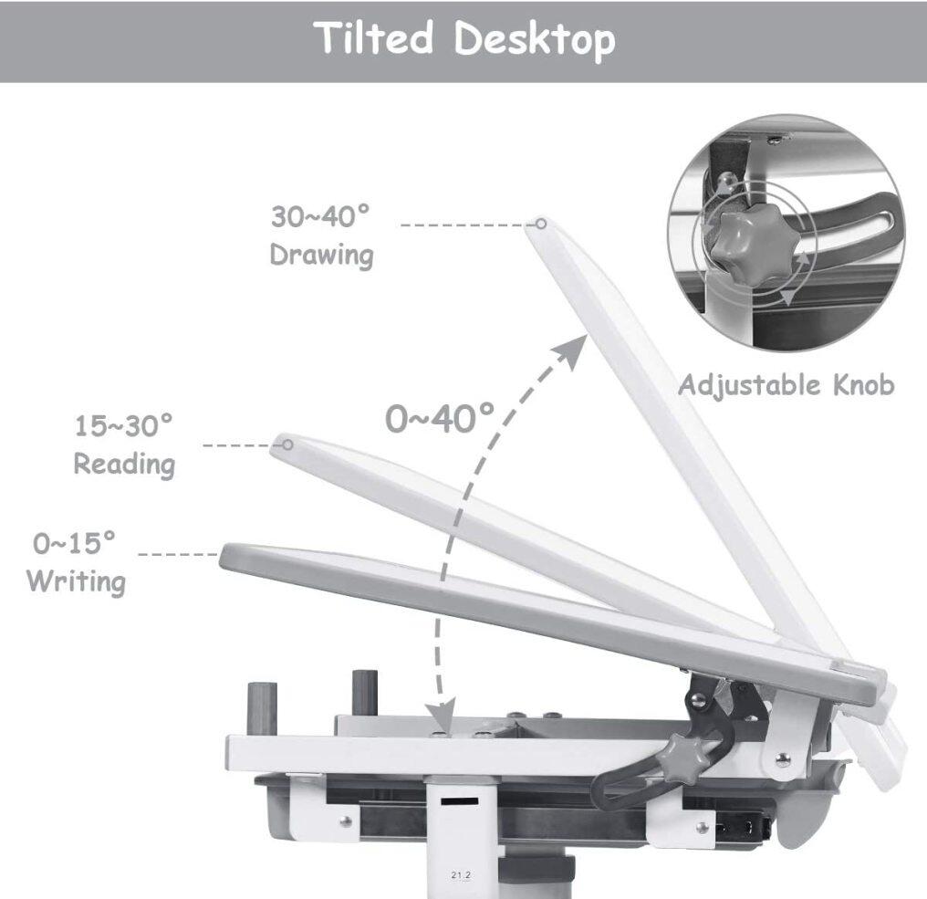 ● Tilted Desktop: The desktop can be tilted from 0° to 40° to meet the different needs of writing, reading and painting. Appropriate angle can help kid protect eyesight and prevent myopia. Equipped with the safety stopper, the desktop can be fixed so that it will not fall off to hurt child's hands.