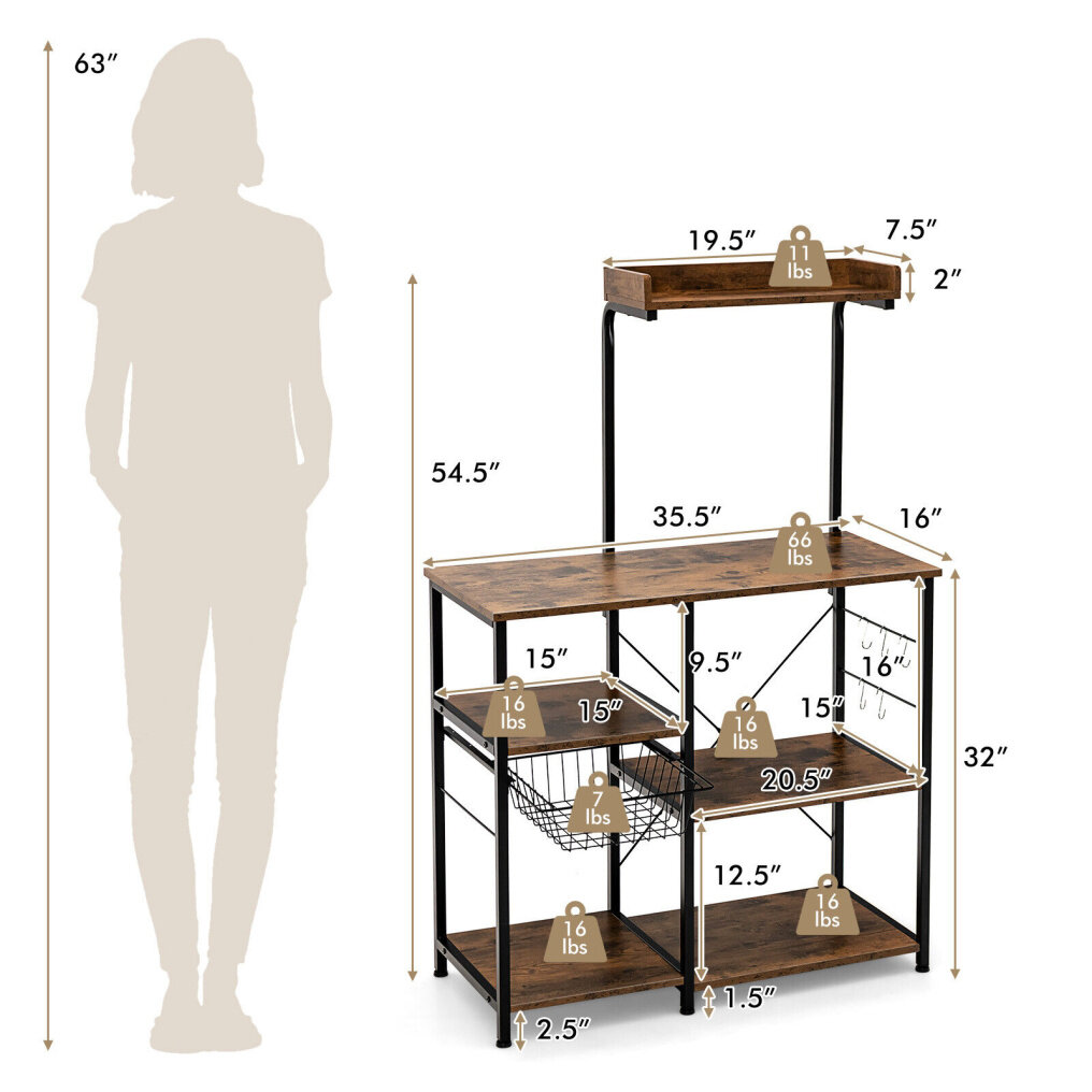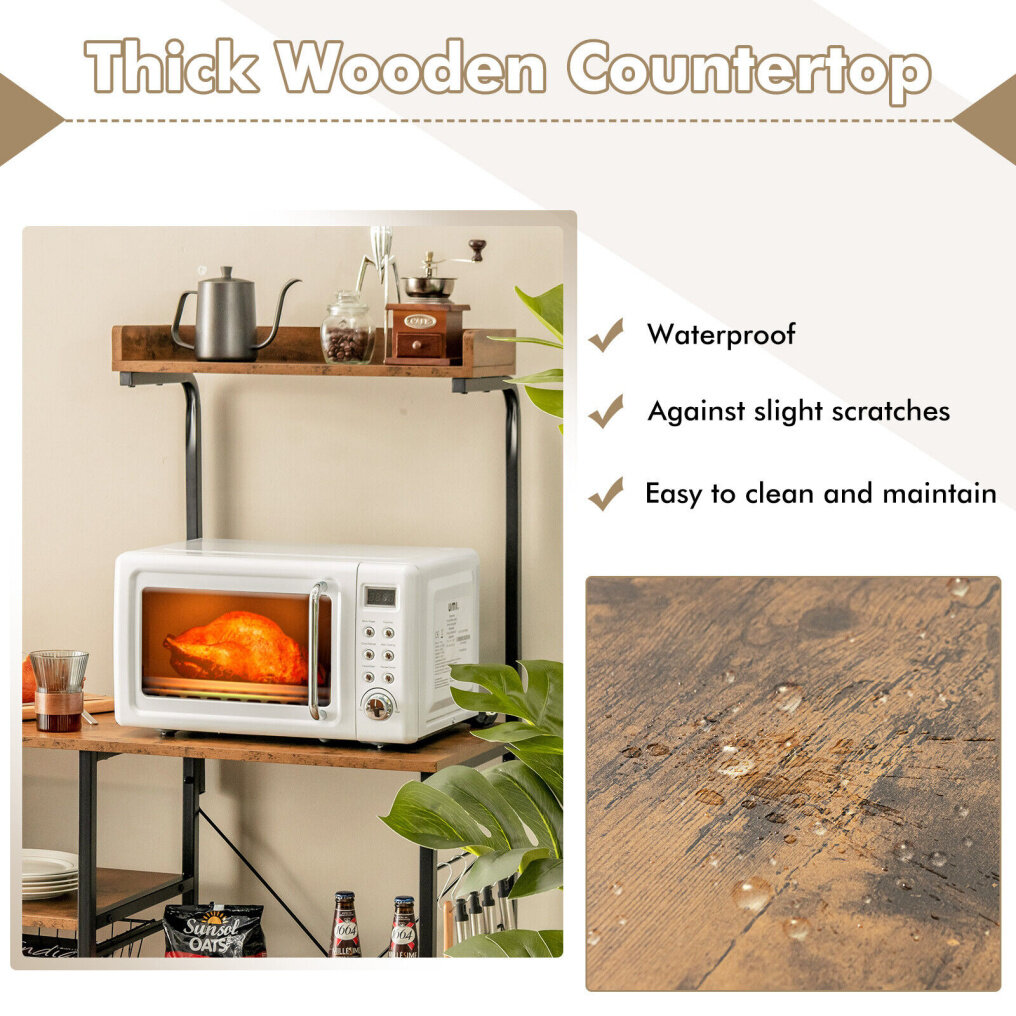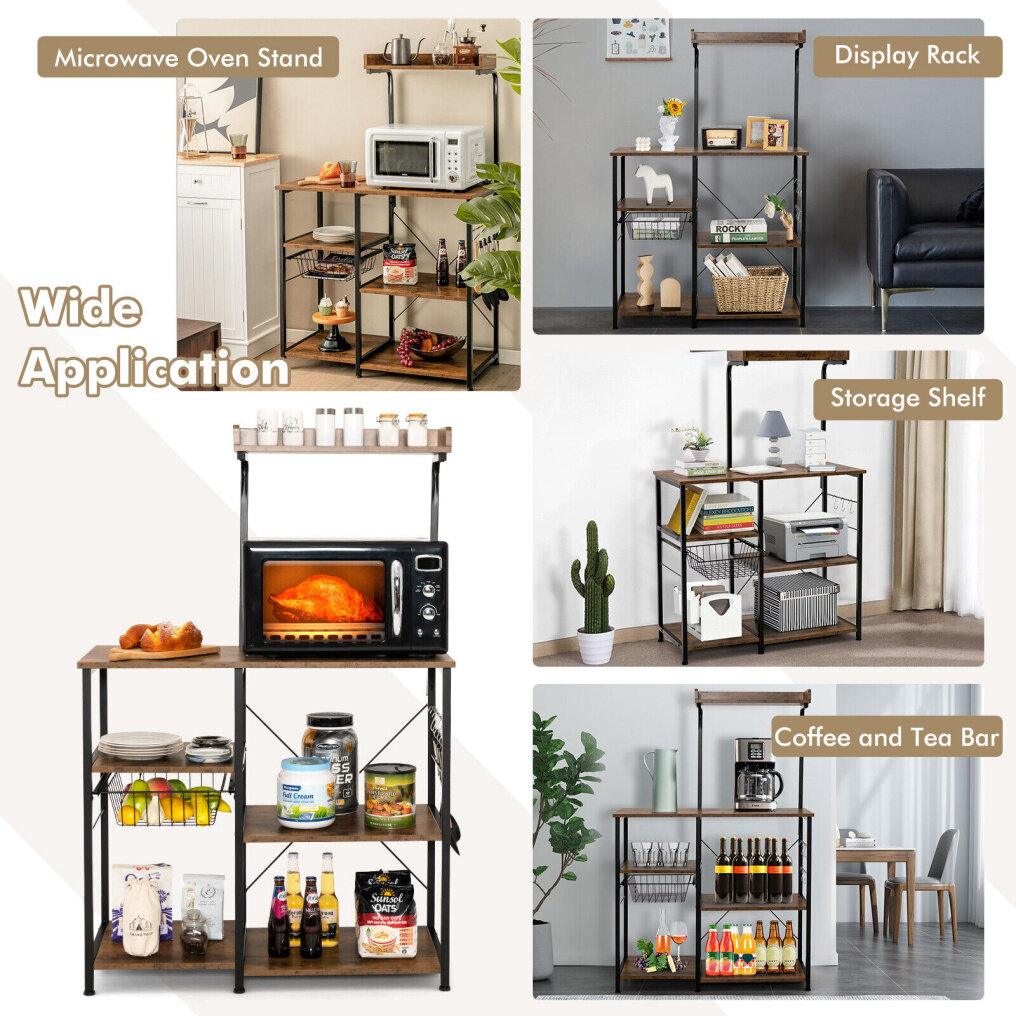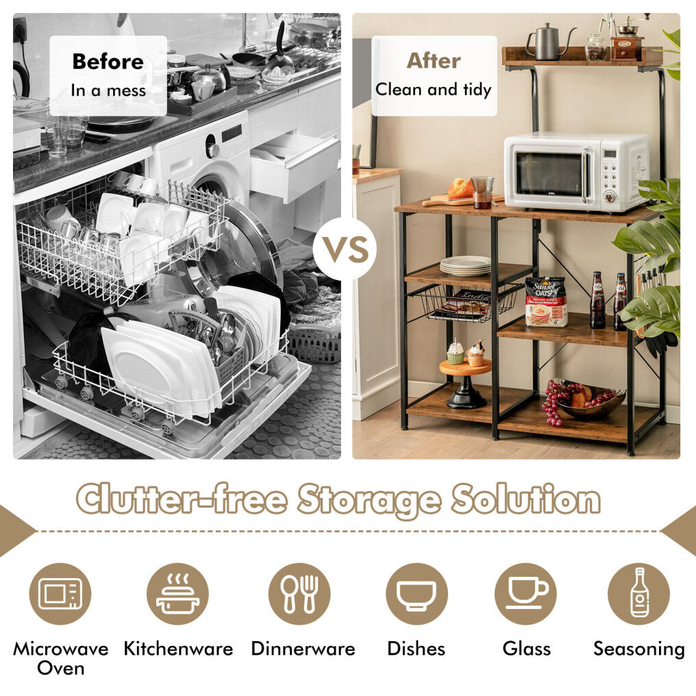 No matter what you want to do, either storage or display, our kitchen baker's rack is your ideal choice. Featuring 5-tier open shelf, the microwave oven stand provides you with ideal storage space to hold kitchen supplies in a neat and orderly way. Moreover, the large countertop and top shelf leave you no worry about the lack of place to store kitchen appliances and spice jars. In addition, the pull-out basket and side hooks allow quick access to the cutlery and cooking tools when you need them. This kitchen storage rack combines functionality and practicality into one, serving great as a microwave stand, coffee bar table, and baker's rack.