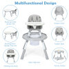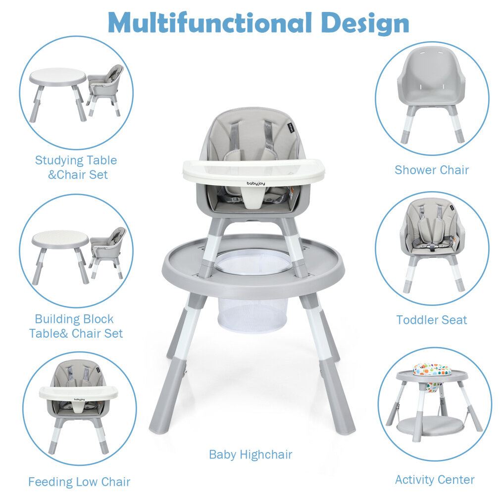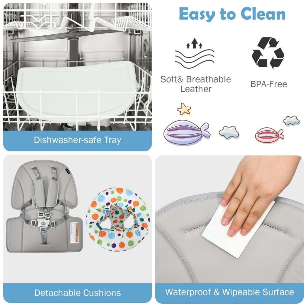 As a baby bouncer, it has a 360° swivel seat and a soft bottom pad for your child to play wild. As a feeding chair, it can either be attached to the table or used independently to adapt to the different use situations. As a table & chair set, it has 2-sided tabletop for kids to draw pictures, read book or build blocks. Meanwhile, you can detach the cushions and trays for cleaning and use the bare chair as a shower seat. In addition to multiple functions, the highchair is also safe and stable for babies, since it has safety belts, anti-skid baffle and anti-slip foot pads. For parents, the assembly and maintenance is also a breeze.