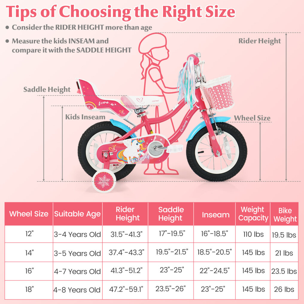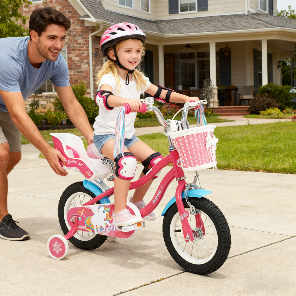 ● All-terrain Tires and Training Wheels: Featuring 2 wear-resistant all-terrain tires, the 14/16/18-inch bike ensures smooth and steady rides on various roads, such as brick roads, wood floors, cement roads, asphalt roads, and more. Plus, 2 detachable training wheels help your little princess keep balance and learn to pedal independently.