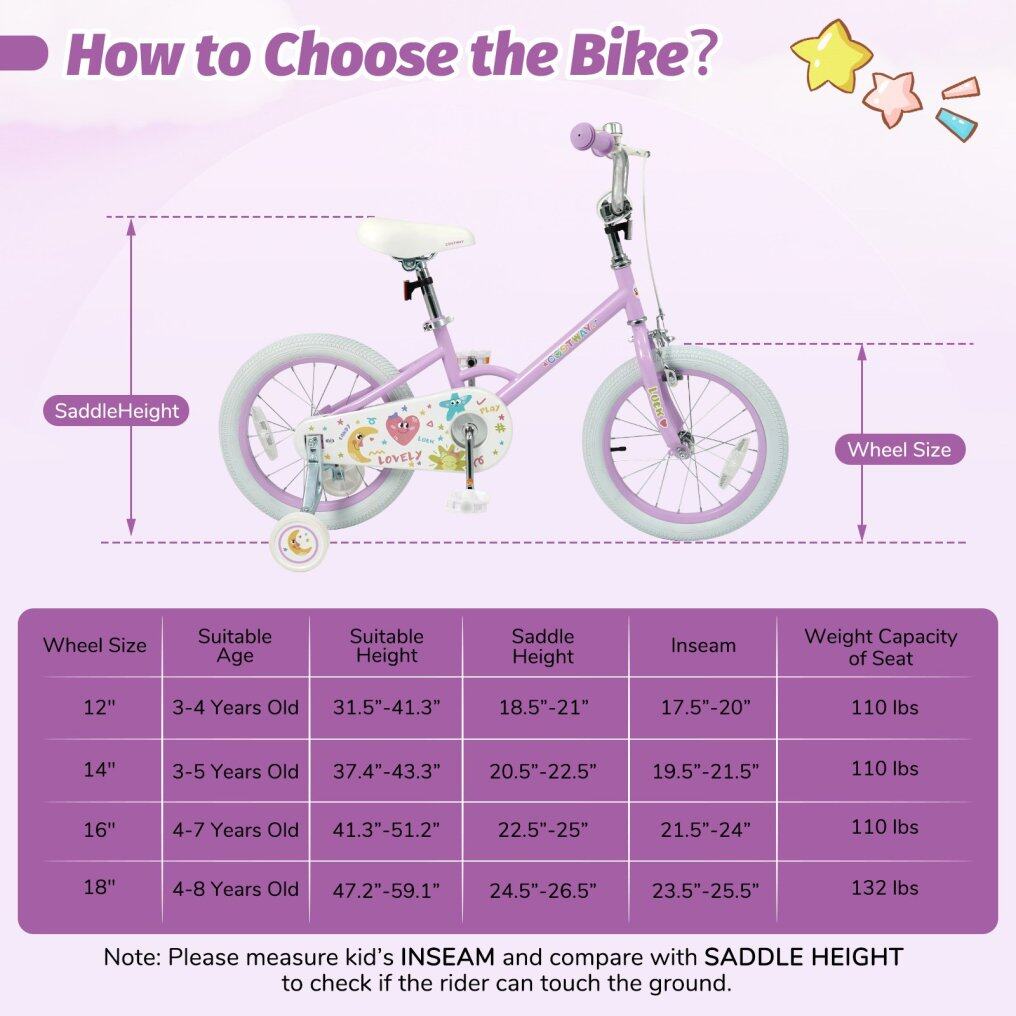 12/14/16/18 Inch Kids Bike Adjustable for 3-8 Years Old Children Purple - Stars & Moon-16 inch