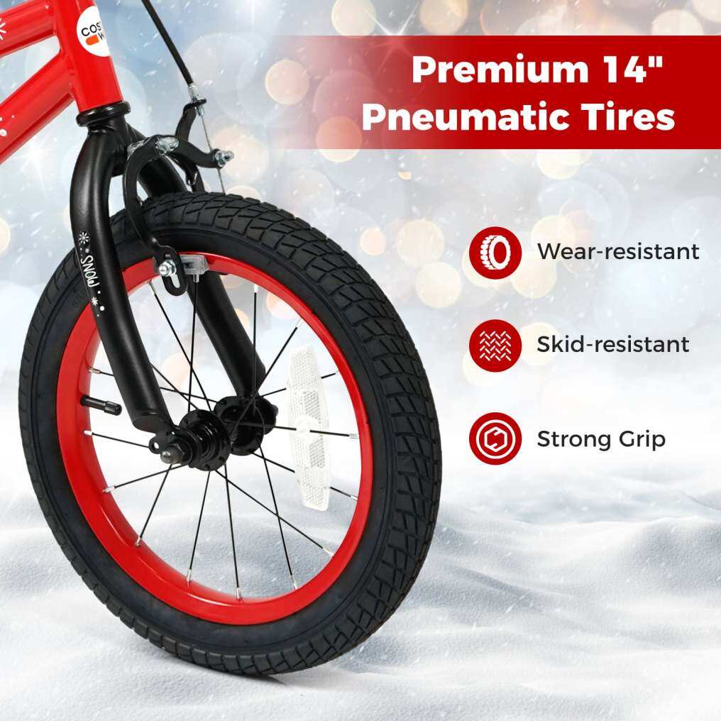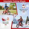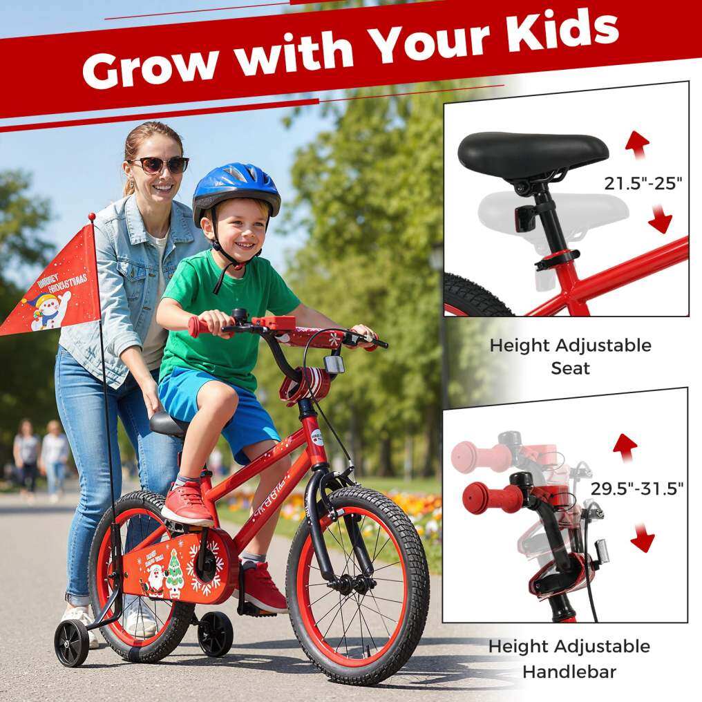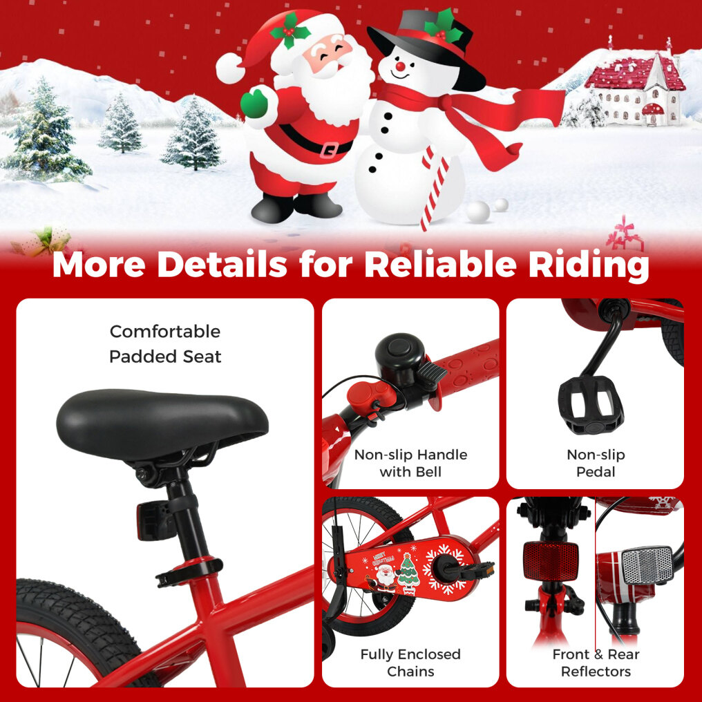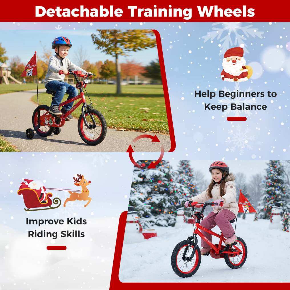 ● Festive & Fun Design: The vibrant red toddler bike with training wheels is adorned with Christmas-themed cartoon graphics. Plus, its built-in audio equipment plays catchy Christmas carols or Santa's greetings and doorbell, making every ride magical and an unforgettable Christmas or birthday surprise.