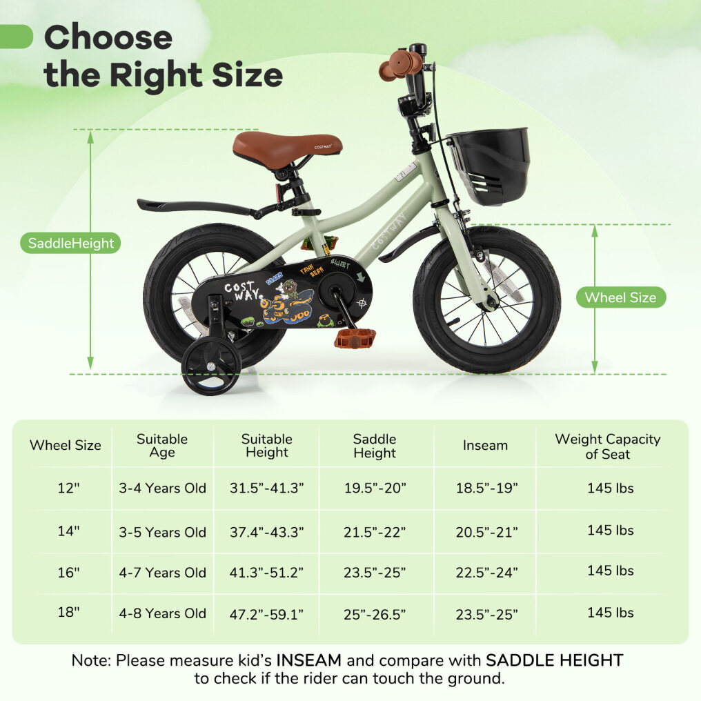 ● 95% Pre-assembled & Optional Size: With included tools and clear user manual, the 95% pre-assembled kids bike can be easily assembled. Additionally, multiple size options are provided, enabling you to choose the right size. The inseam size is 18.5"-19"/20.5"-21"/ 22.5"-24"/ 23.5"-25". Note: Please measure kid's INSEAM and compare with SADDLE HEIGHT to check if the rider can touch the ground.
