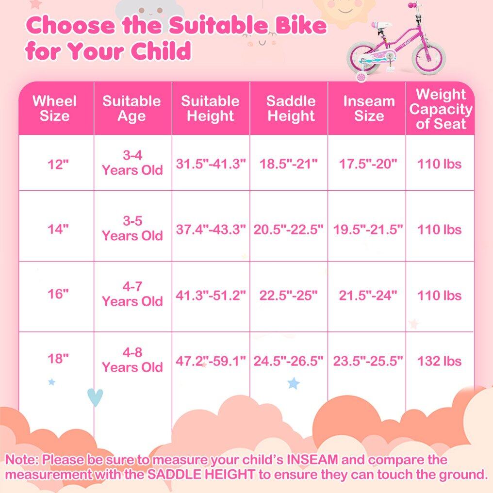 ● Pre-assembled Bike: The pre-assembled bike with tools makes assembly a breeze. You just need to install the front wheel, handlebar, seat, training wheels, pedals, and reflectors. There are 4 available wheel sizes for 3-8 years old kids. Note: Please be sure to measure your child's INSEAM and compare the measurement with the SADDLE HEIGHT to ensure they can touch the ground.